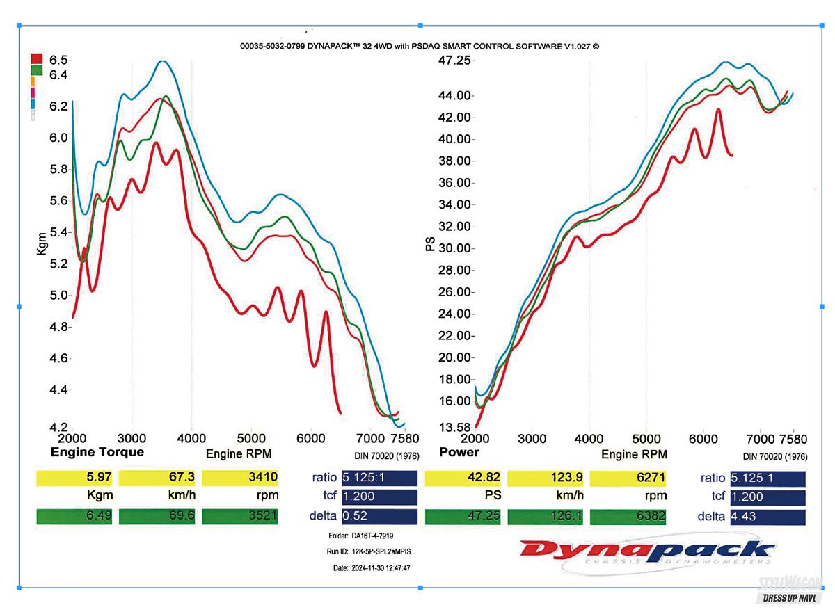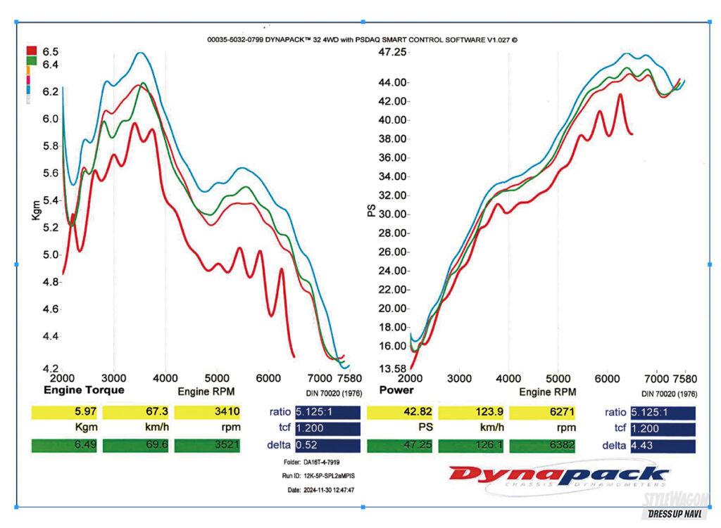 燃料代に配慮したレギュラー仕様ながらレブリミットは7800rpmまで引き上げ、実用域である中間のパワーとトルクを太らせるようダイノパックでセッティング。同じくオリジナルの『MPIS』と組み合わせたテストでは、4.43ps&0.52kgmという大幅なアップを実現できている。狙いどころの中間域もパワーデータのグラフを見れば違いが一目瞭然だ。
