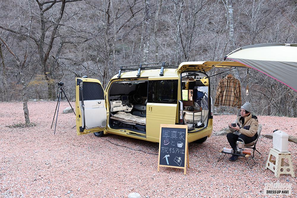 写真家の小川元貴さんは“仕事”“車中泊”と高度に組み合わせた仕様をコーディネイト。車内に飾ってあった美しい山の写真を撮る時のように、前乗り→現場に行くのもコレならスムーズ。しかもEVならではの給電機構を駆使して、車内で画像の編集まで可能。「天井が高いので機材も積める。クルマ自体が移動できる事務所ですね」と小川さん。