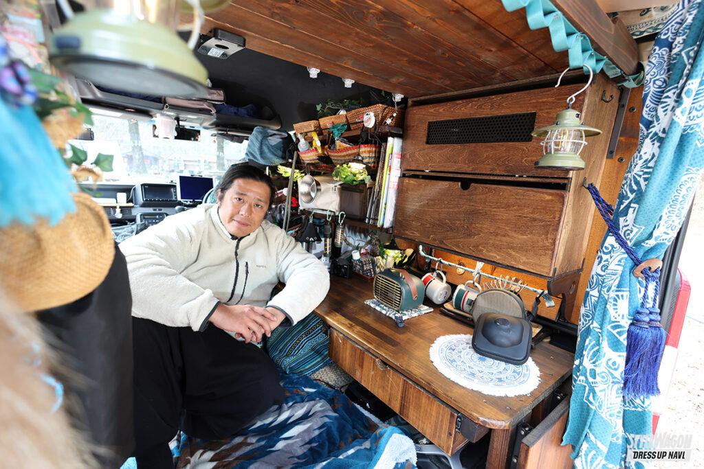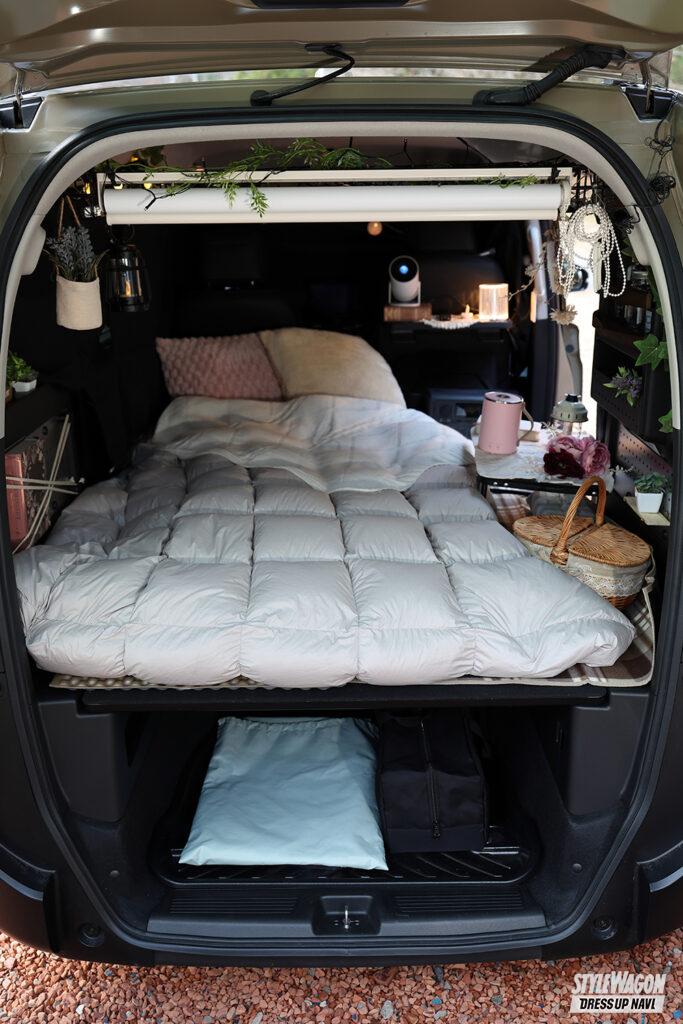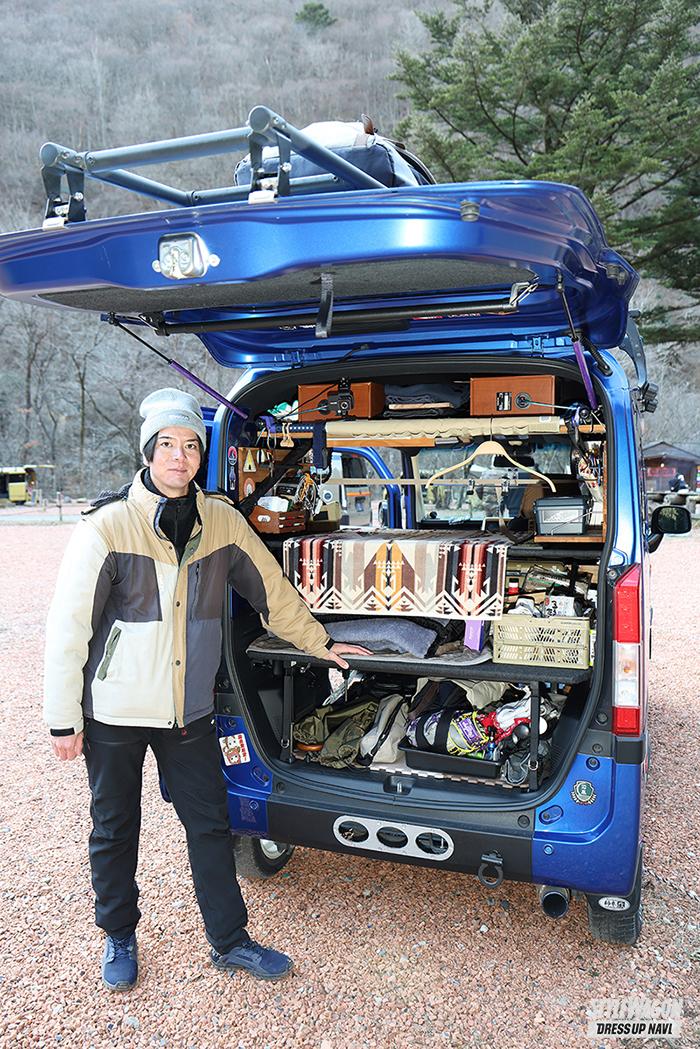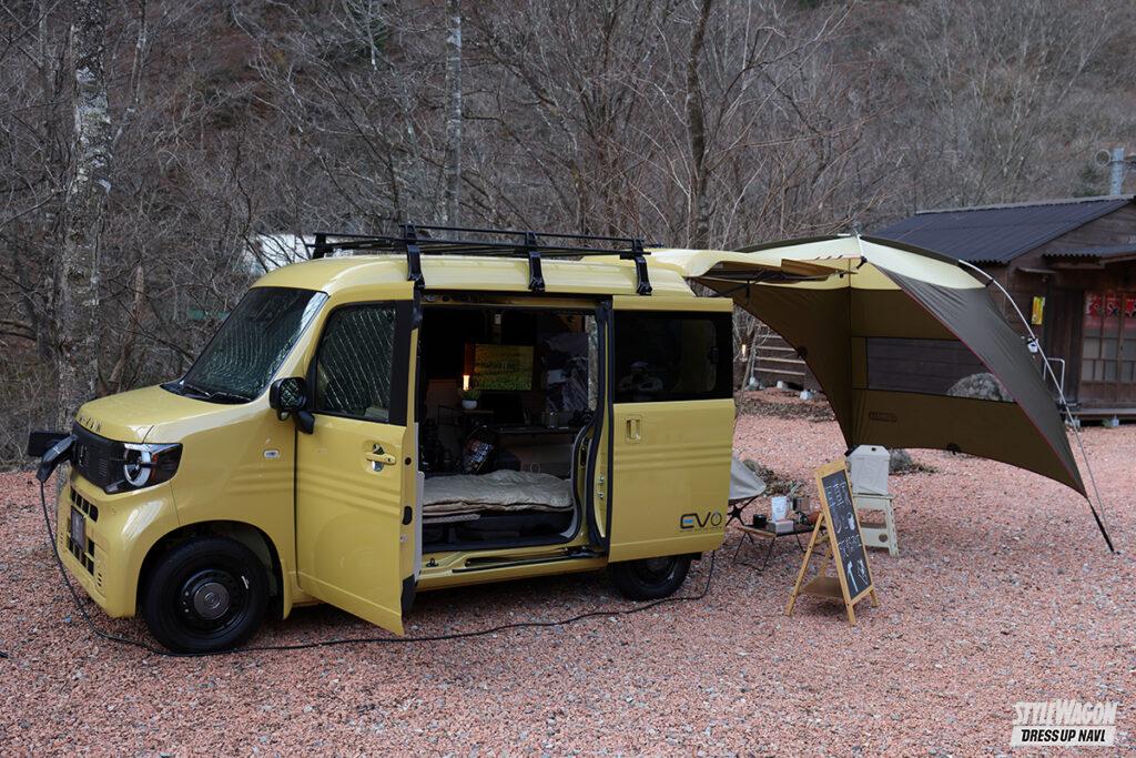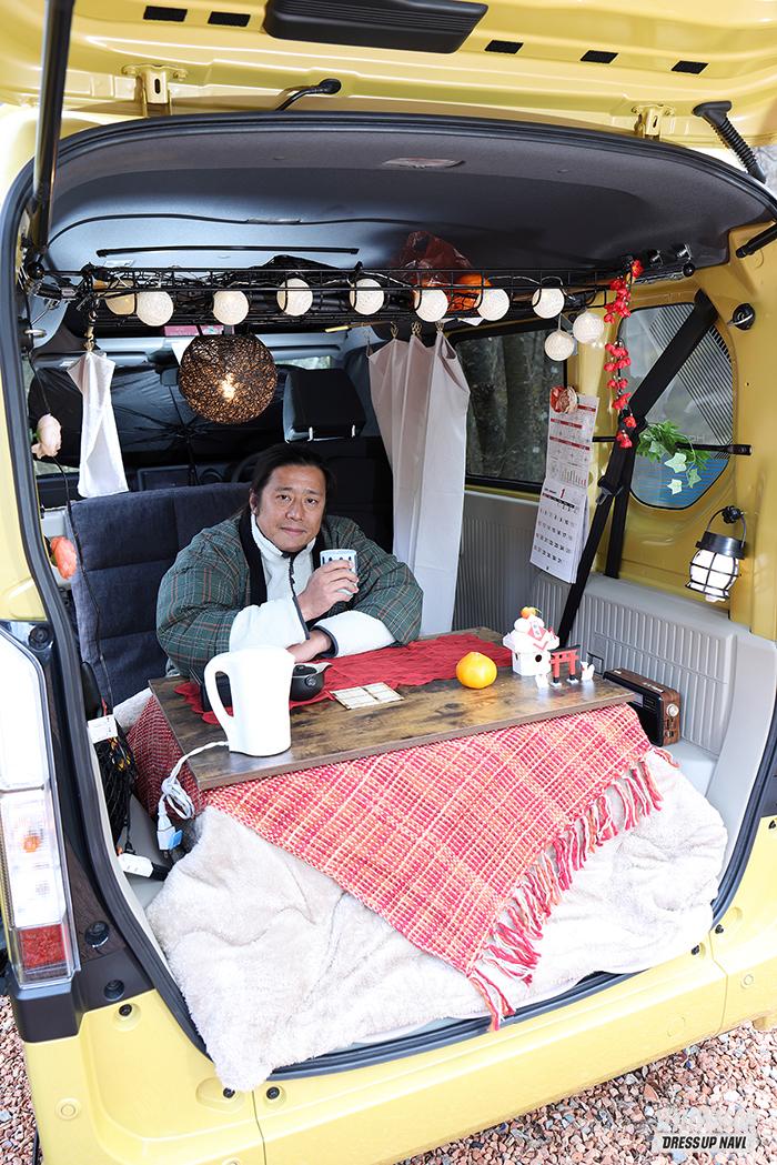 『カーネル』誌に寄稿するライターにして、年間300日以上車中泊するruiさんは、EVをフル活用しコーディネイト。季節柄コタツ仕様にしたのだ。「コレで40時間いける」そうで、就寝時にも利用可能。コタツやマットは誰でも買えるモノなので真似もしやすい。積載量を増やす『ルーフキャリア』、小川さん同様の給電関係は純正アクセサリーだ。