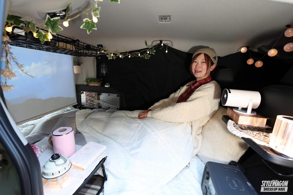 軽ベースのキャブコンで北海道をベースに活動するまるなな さん。『カーネル』誌で活躍するライターで、本州にもそのキャブコンで旅、仕事で走り回っている。フリードクロスターは「アクセサリーが豊富でやることがない」が、冬に楽しく車中泊をするためシアター仕様を提案。車内が真っ暗になる『プライバシーシェード』を活かした仕様でもある!