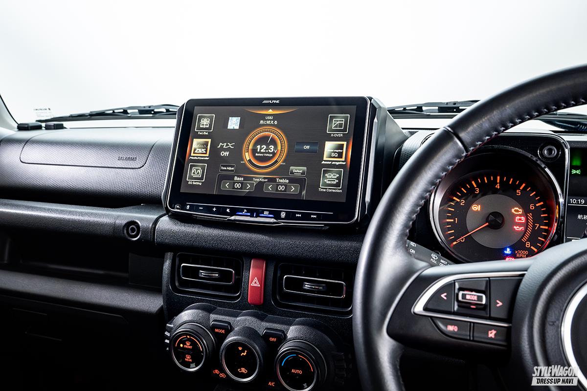 車種専用にもこだわってきたカーナビ「ビッグX」で多くのファンを得ているアルパインは、ディスプレイオーディオ「ビッグDA」にも車種専用を設定。新たに登場したのは、JB64ジムニー&JB74ジムニーシエラ専用モデルで、ダッシュボードと自然に繋がるパーフェクトフィットシリーズとしてのリリースとなった。車種専用ならではのこだわりは、純正と変わらぬ取り付け位置の高さで前方視界を確保し、専用パネルはジムニーらしいラギッドなデザインを採用。さらにイグニッションONで表示するオープニングにはジムニーのイラストが登場し、ジムニーの車室内の音響特性を考慮したサウンドセッティングにも対応する。またナビ同様、同ブランド製品を使った拡張性の高さも魅力だ。