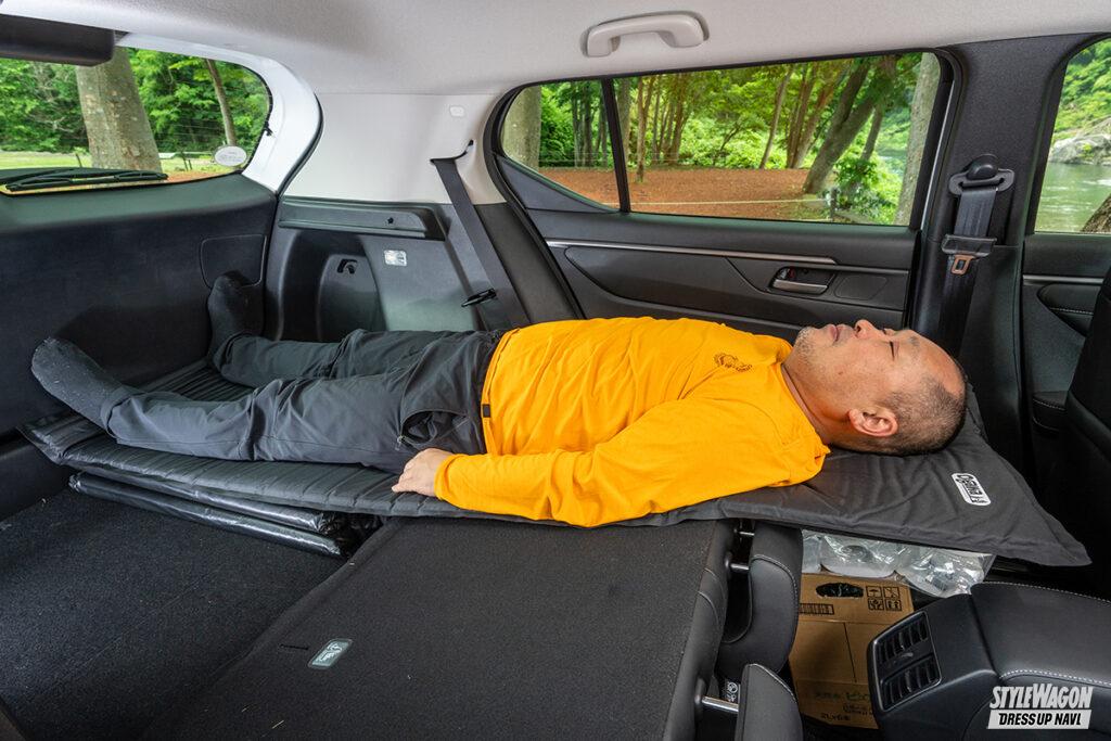 SUVは後席を倒して就寝スペースを作るのが一般的。「WR-V」の場合、これだけでは寝転ぶための長さが足りないので、前席を前にスライドさせ、後席と前席の隙間も利用するのがポイント。そこで今回役立ったのが2ℓの水1ケースとトイレットペーパー1袋(18ロール→カメラマンが奇跡的に車に積んでいた!)。この2つが隙間にジャストフィットしたうえ、トイレットペーパーが寝転んだ時にちょうど頭の位置にくるためクッション性も最高! まさかの便利アイテムになりました。