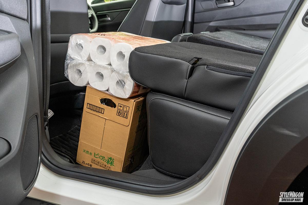 SUVは後席を倒して就寝スペースを作るのが一般的。「WR-V」の場合、これだけでは寝転ぶための長さが足りないので、前席を前にスライドさせ、後席と前席の隙間も利用するのがポイント。そこで今回役立ったのが2ℓの水1ケースとトイレットペーパー1袋(18ロール→カメラマンが奇跡的に車に積んでいた!)。この2つが隙間にジャストフィットしたうえ、トイレットペーパーが寝転んだ時にちょうど頭の位置にくるためクッション性も最高! まさかの便利アイテムになりました。