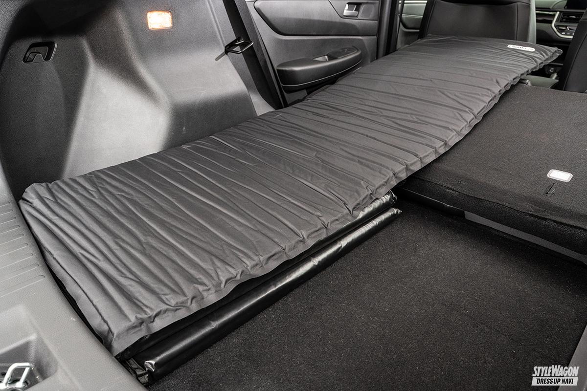 そんな「WR-V」での車中泊は想像以上に快適! 就寝スペースの確保は前席を前にスライドして後席を倒すだけ。ただこのまま寝るのは少々厳しい。「WR-V」は荷室部分が後席よりも低くなっているため約120mmの段差ができてしまう。この段差を埋めるためにテントのインナーマットとして使用する厚手のマットとブランケットを使い高さを調整。次は長さの問題。荷室と後席の背面部分だけだと長さが1400mm程度と、大人が寝るにはかなり短い。そこで助手席と後席の間にできる隙間を利用。2ℓの水1ケース等を使って隙間と段差を整え、足りなかった長さもしっかり確保。あとは車中泊用のマットを敷いて就寝スペースが完成。ただ気になるのは後席を倒した時にできる傾斜。見た目はかなり斜めに見えるが、頭を高い位置に置いて寝れば全く気にならないほどぐっすり眠れた。少々準備に手間はかかるが、車中泊の選択肢としては申し分なさそうだ。