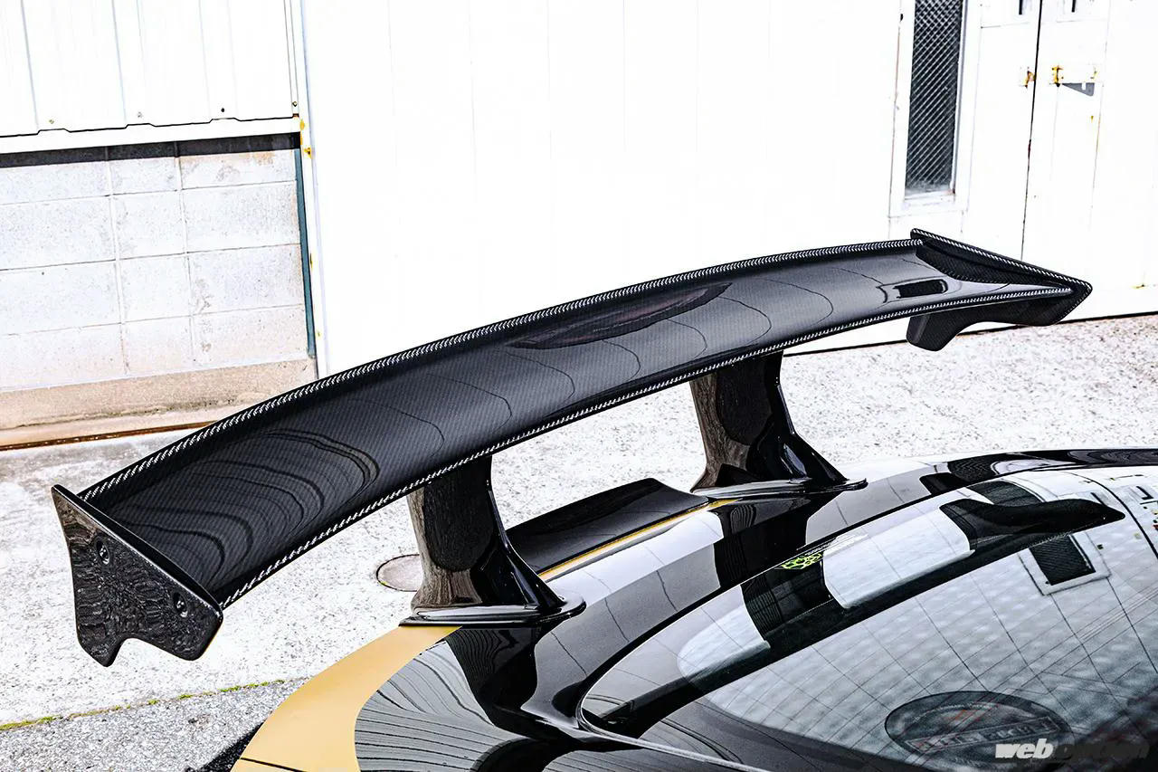 ホイールの選択肢を広げるために、リヤには片側約10mmのワイド化を実現する貼り付けタイプのカーボンオーバーフェンダーをインストール。