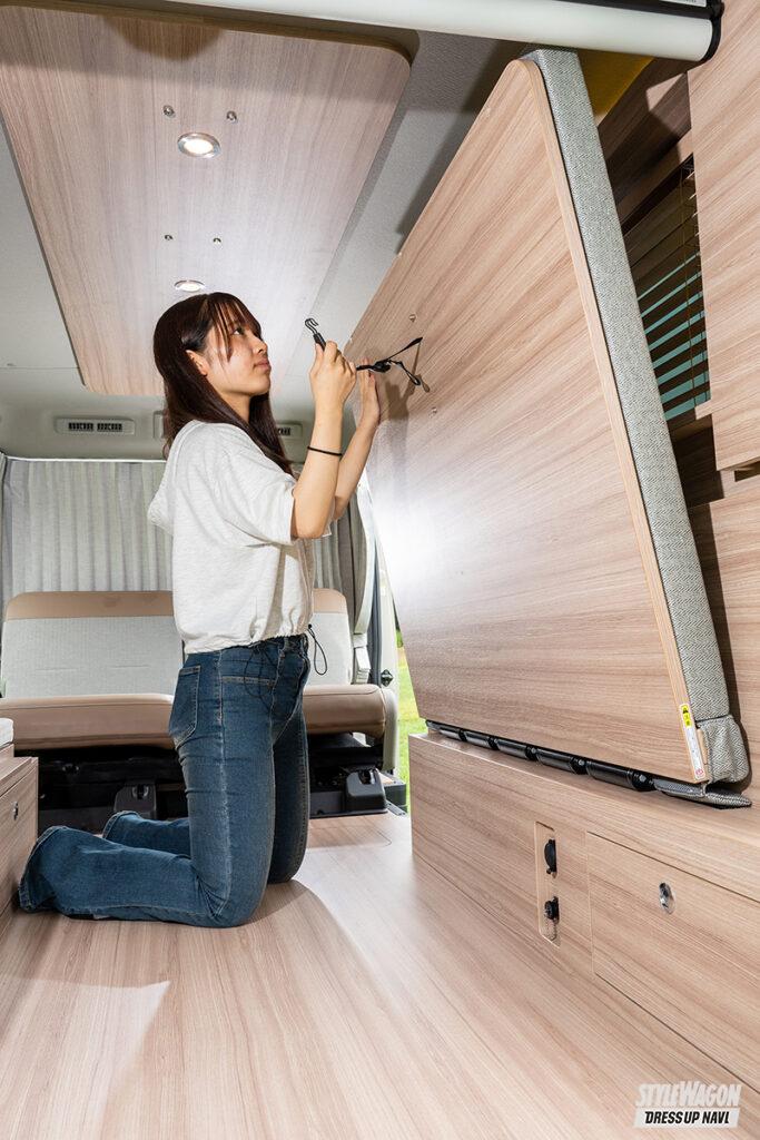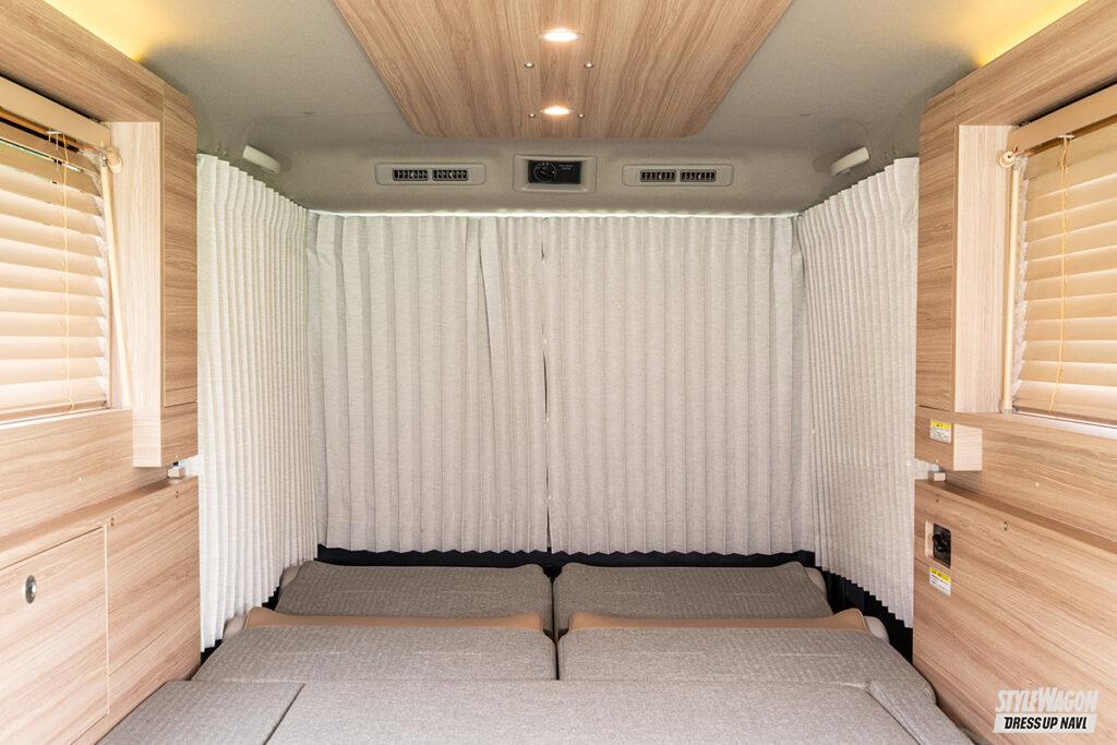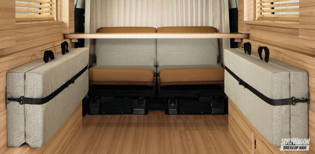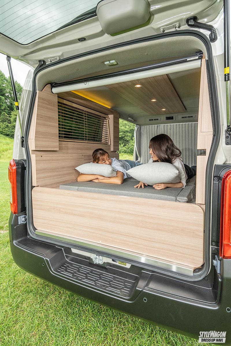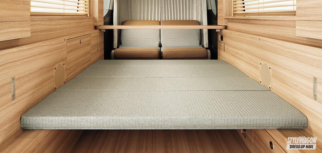 車中泊の要となるベッドキットは2種類用意される。撮影車両は架装オプションとなる「跳ね上げベッド」で、使わない時は壁面に立てかけて固定する。ベッドサイズは幅1204mm、ベッド長2192mm(シート部分含む)、ベッド上高さ970mm。大人ふたりが寝るには十分すぎる広さだ。また、ベッド下が収納スペースになるのもうれしいポイント。ベッド下の高さは256mm確保しているので、嵩張りがちな着替えなども放り込んでおける。