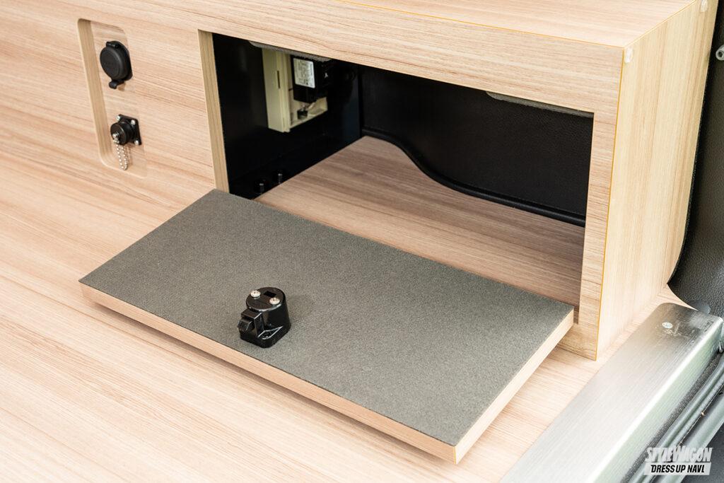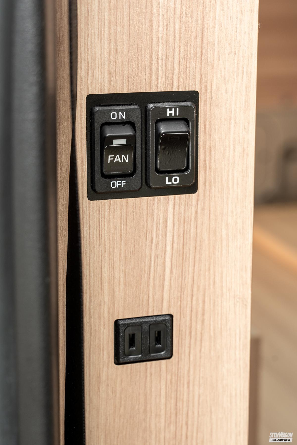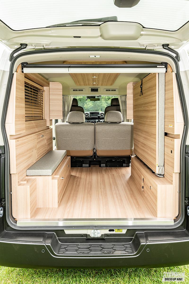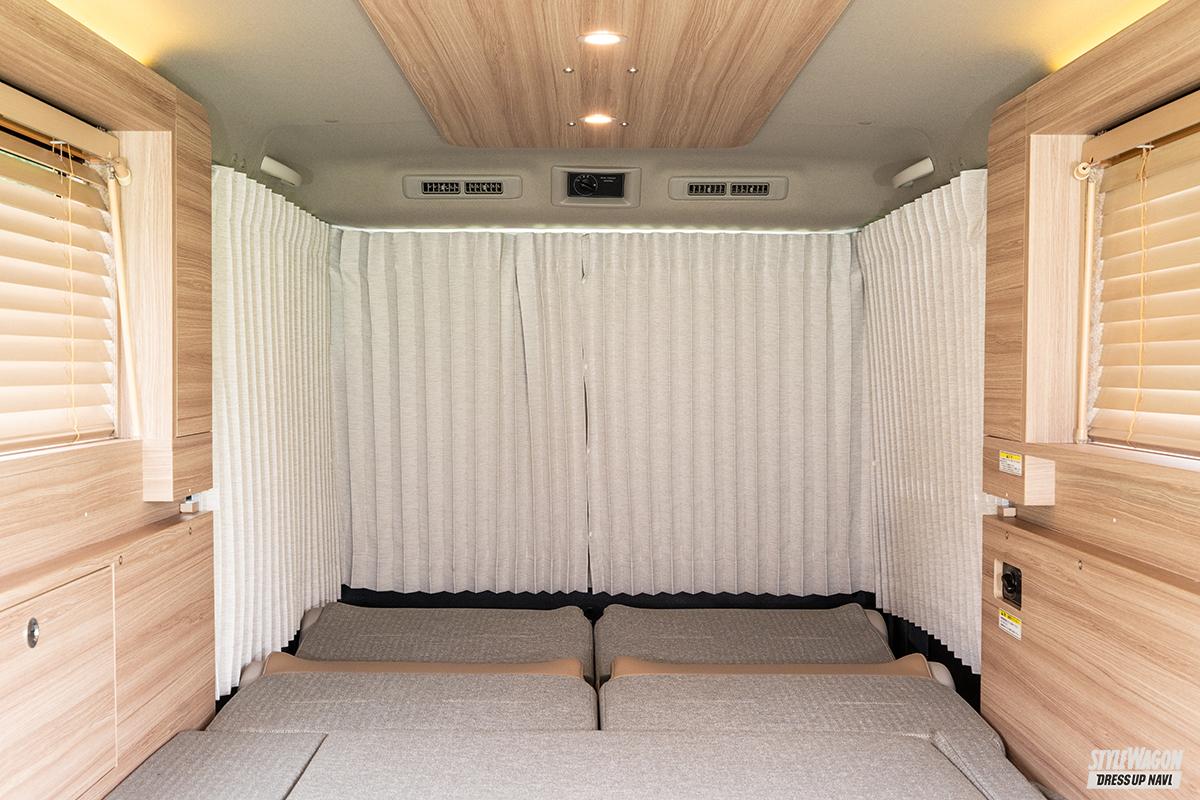 車中泊の要となるベッドキットは2種類用意される。撮影車両は架装オプションとなる「跳ね上げベッド」で、使わない時は壁面に立てかけて固定する。ベッドサイズは幅1204mm、ベッド長2192mm(シート部分含む)、ベッド上高さ970mm。大人ふたりが寝るには十分すぎる広さだ。また、ベッド下が収納スペースになるのもうれしいポイント。ベッド下の高さは256mm確保しているので、嵩張りがちな着替えなども放り込んでおける。
