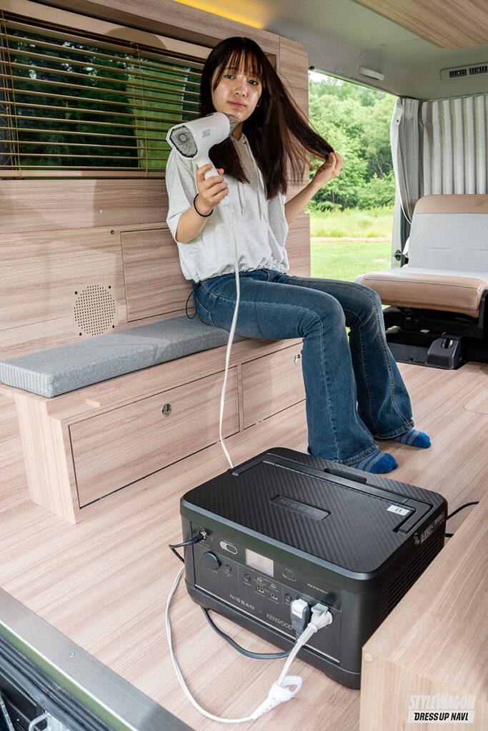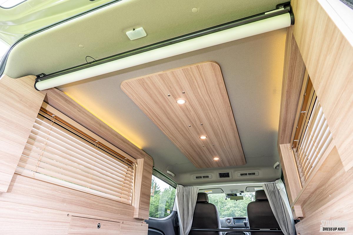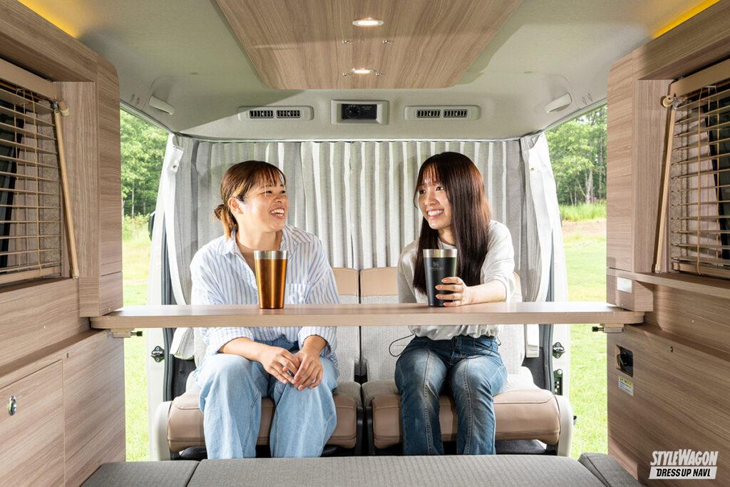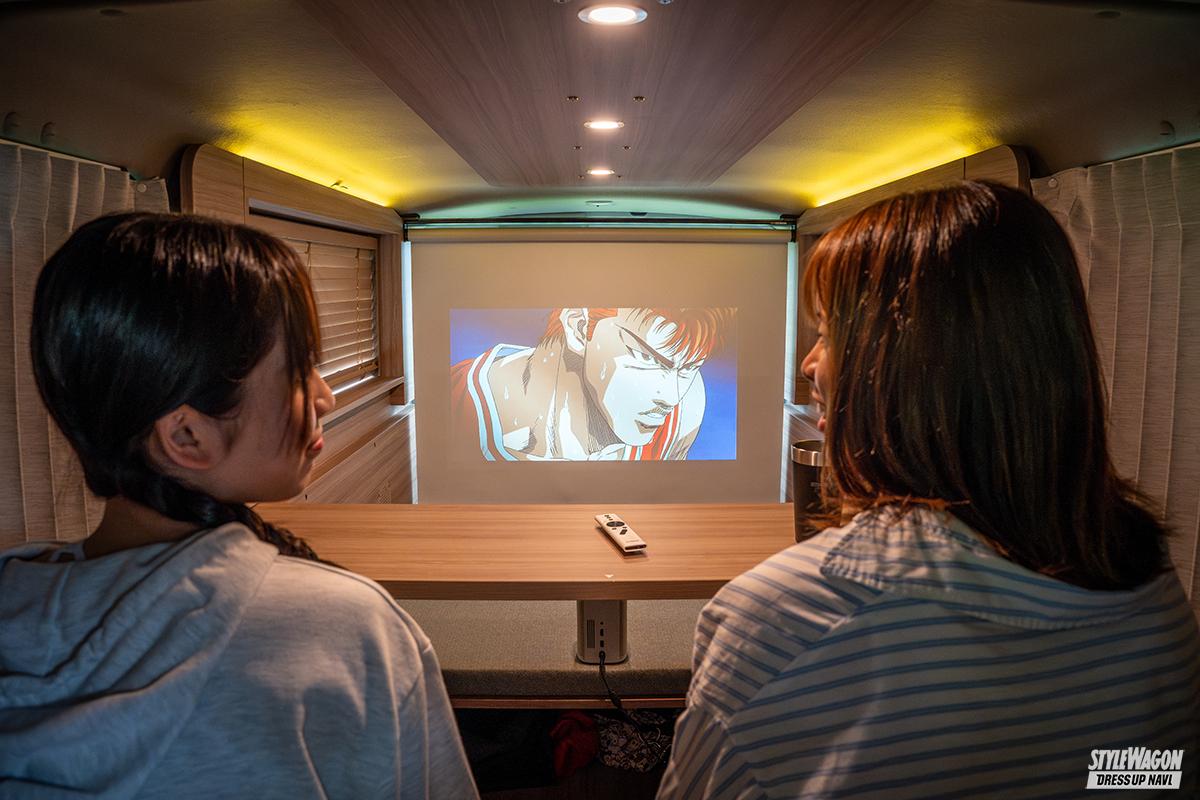 今回娘の友達も誘って女子ふたりでの車中泊となったが、アウトドア初心者にとってキャンプで一番面倒なのが「設営」と「片づけ」。車中泊であればテントを立てる必要はないが、それでも就寝スペースを作ったり、快適に寝るために必要なものを揃えたりと「分からないことが多くて不安・・・」というのが本音のようだ。しかし「キャラバン MYROOM」は、必要なものが揃っているうえ、楽しい女子会を盛り上げてくれる装備が満載。様々な仕様にモードチェンジできる「2in1シート」や、布団要らずで寝転んでも快適なベッドキット、車内で安心して着替えられるカーテン&ウッドブラインドなど、なんの心配もせずに車中泊が楽しめる。そして夜の女子会を盛り上げるのがロールスクリーン。モバイルプロジェクターなどを用意して投影すれば、動画や映画が大画面で楽しめる。