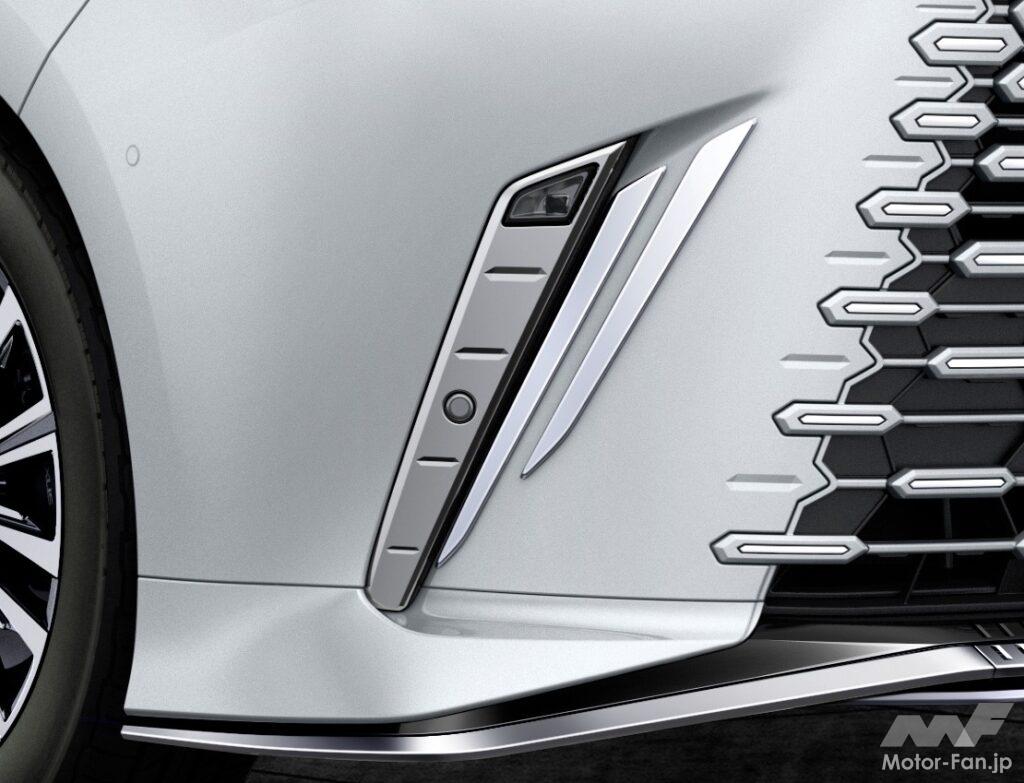 フロントスポイラーは、センターからサイドに流れるダイナミックな造形テーマで、堂々とした佇まいと威厳のあるフロントフェイスを創出。中央部のスリット造形は先進感あるフロントフェイスをより際立たせると共に、太陽光を反射し、煌びやかな表情を演出する。