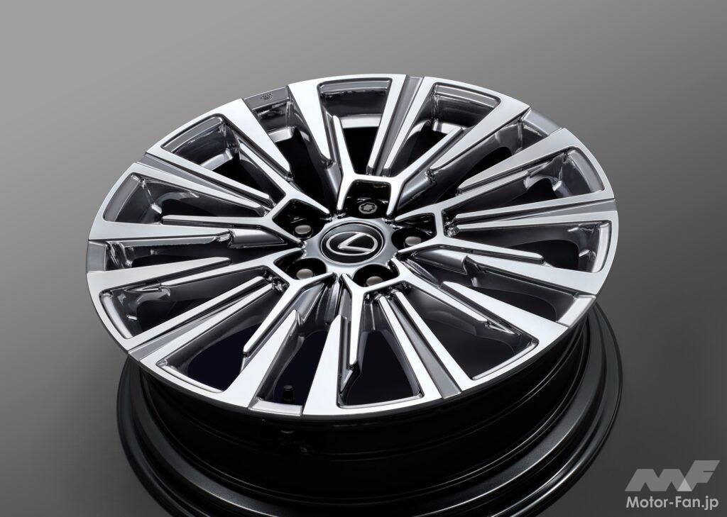 新型LMの足元を際立たせる19インチ鍛造アルミホイールをラインナップ。乗り心地を重視し、ベース車と同じサイズの19インチに設定した。ダークスパッタリングと切削加工の組合せにより、奥深い質感と煌びやかな表情をみせるとともに、力強い立体篏合と放射状に広がるスポークデザインにより、大径感のあるダイナミックなスタイリングを創出ている。カラーは、ダークスパッタリング×ポリッシュ。セキュリティロックナットがセットとなる。