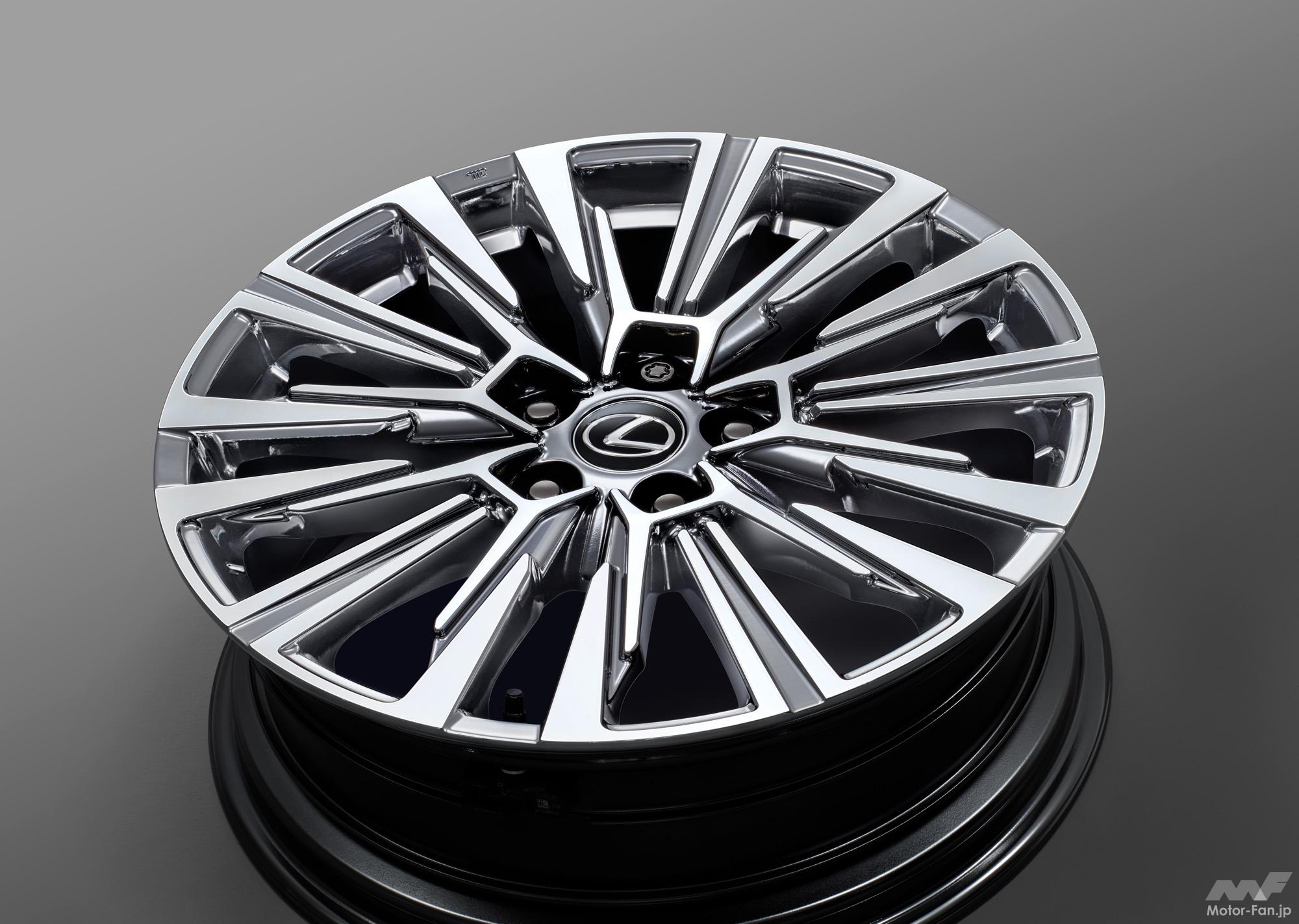 新型LMの足元を際立たせる19インチ鍛造アルミホイールをラインナップ。乗り心地を重視し、ベース車と同じサイズの19インチに設定した。ダークスパッタリングと切削加工の組合せにより、奥深い質感と煌びやかな表情をみせるとともに、力強い立体篏合と放射状に広がるスポークデザインにより、大径感のあるダイナミックなスタイリングを創出ている。カラーは、ダークスパッタリング×ポリッシュ。セキュリティロックナットがセットとなる。