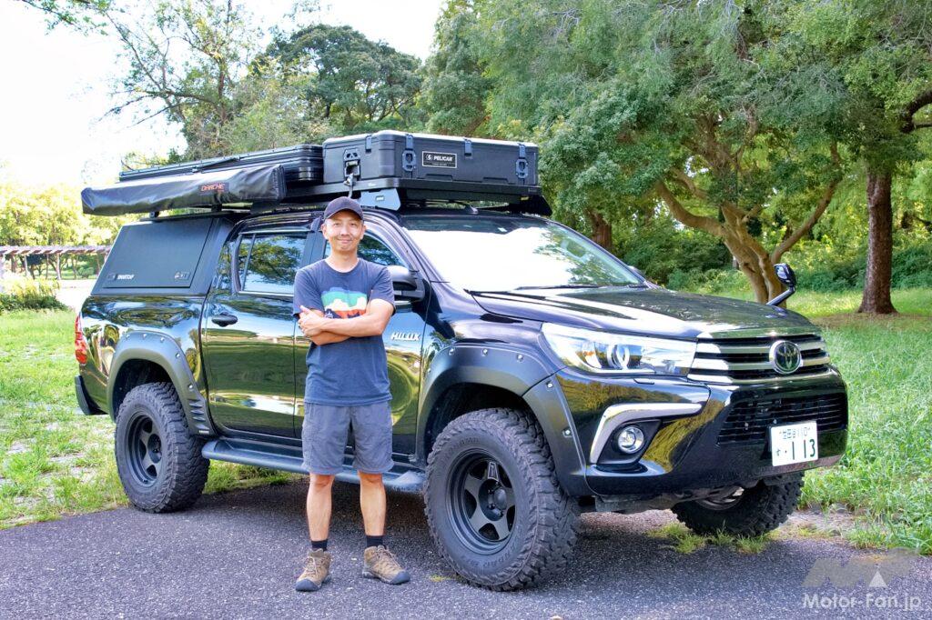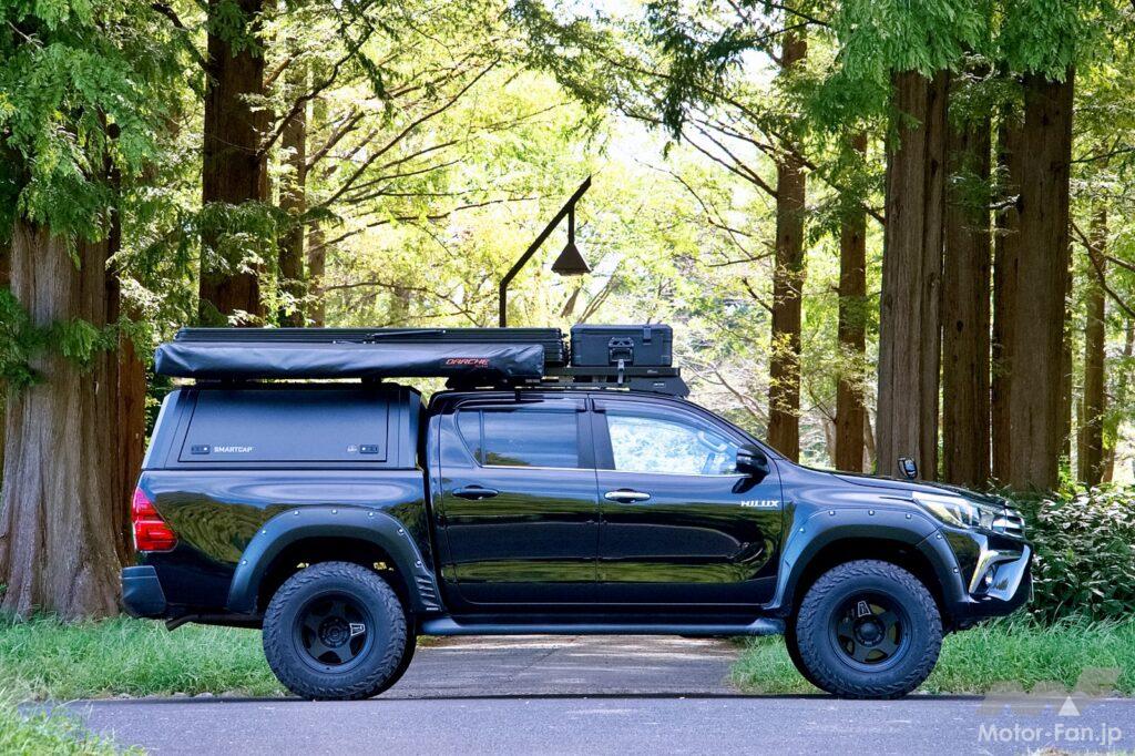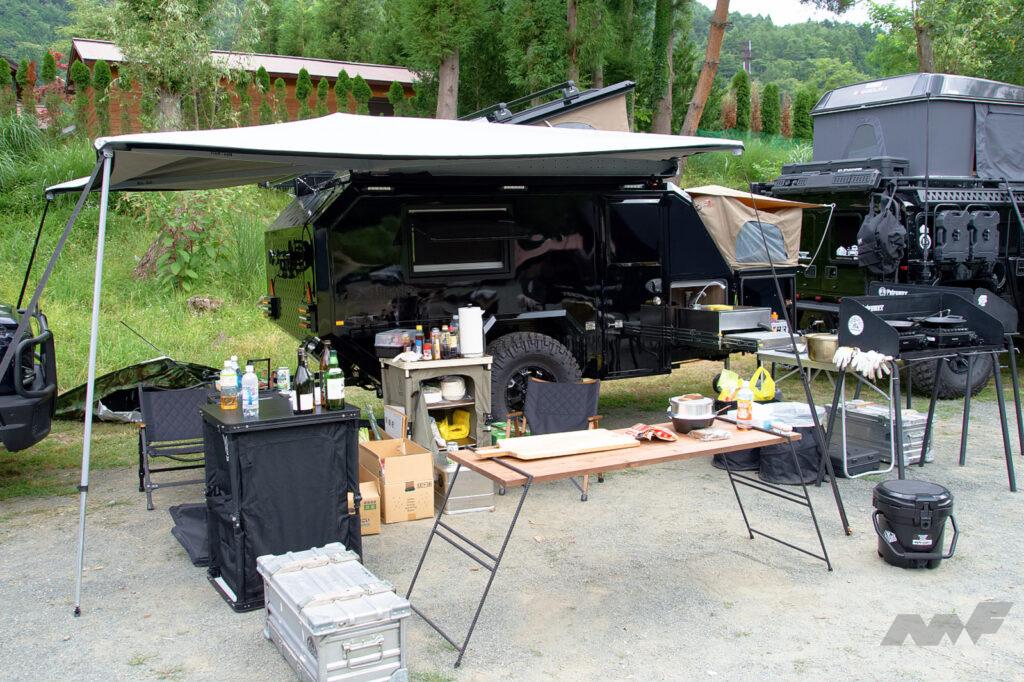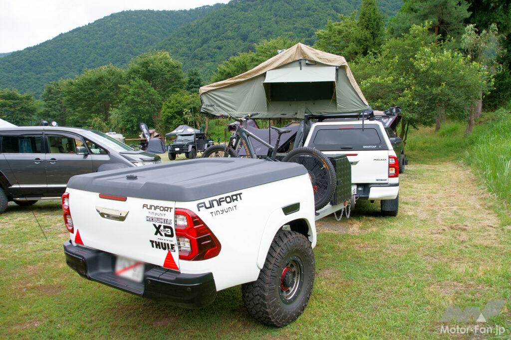 この車両は、キャンプ用カスタムトレーラーを手掛ける「FUNFORT社(https://funfort.jp/)」のデモカー。本来ならば、クルマ側(ハイラックス+キャノピー+THULE社製のルーフトップテント)だけでも立派なオーバーランダーといえるが、これにハイラックスの荷台を架装したトレーラーがドッキングされており、見た目も積載力も大幅にグレードアップされている。