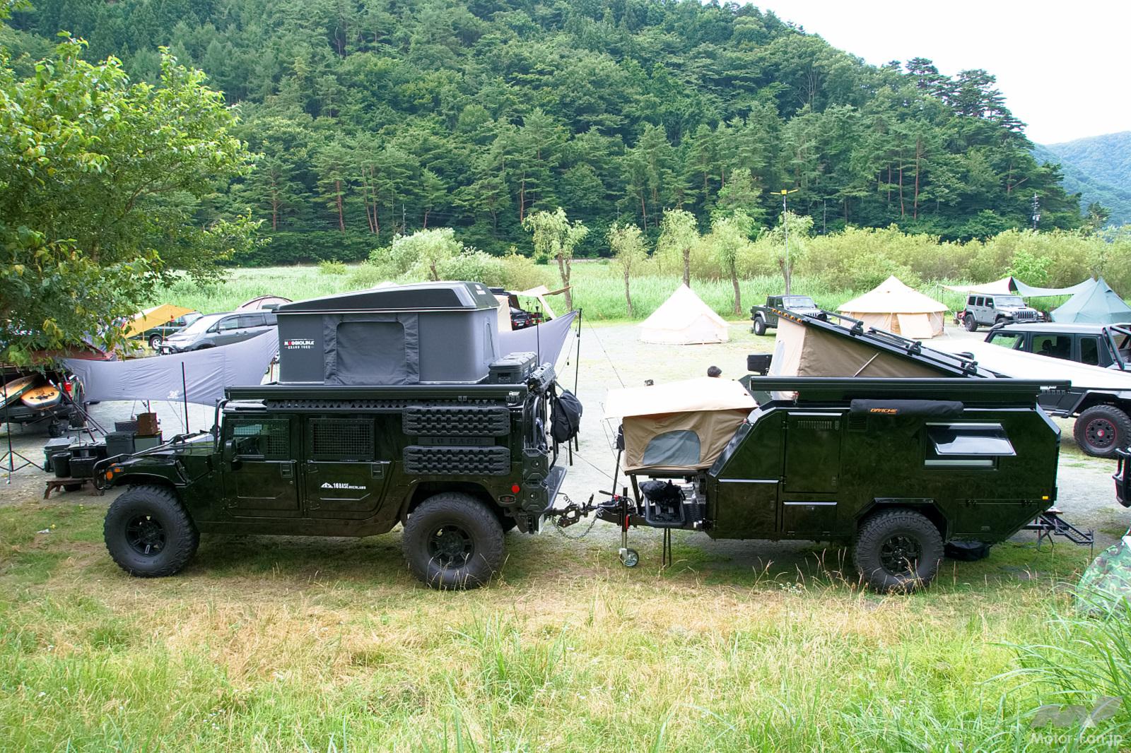 数あるオーバーランドスタイルの中で、名実ともに最強のオーバーランダーといえるのが、こちらのハマー・タイプ1+ルーフトップテント+テントトレーラーだ。ハマーのルーフにはMAGGIOLINA社製のルーフトップテントを搭載し、FFヒーターや外部シャワーを装備したFUNFORT社製の特注トレーラーを組み合わせたスタイルは、通常のキャンピングトレーラーとは一線を画した、まさに冒険旅行のためのオーバーランドスタイルといえる。