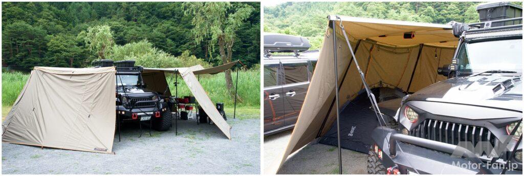オーバーランドスタイルの番外編として紹介したいのは、クロカン4WD+オーニング(エクステンション付き)+カンガルーテントのパターン。こちらはジープ・ラングラーにDARCHE社製のオーニングを左右1台ずつ取り付け、さらにエクステンションで周囲を囲むことで、クルマを中心とした簡易的なキャンプサイトを構築している。テントはカンガルースタイル(大きなテントの中に小さなテントを設置するスタイル)で、オーニング内部に設置するだけなので、設営も撤収も素早くできるはず。これもナイスアイデアだ!