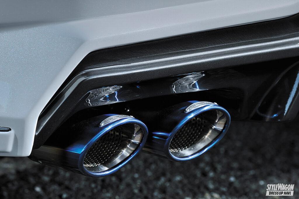 縦フィン付きで高級感とスポーツ感を両立させたリアハーフスポイラーは、先にデビューした左右シングル出し仕様と形状は変わらないながらも、マフラー出口を4本出しに対応させることで、より迫力を生み出すことを叶えている。