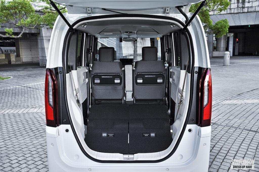 VAN e:は“真っ平”なラゲッジルームを生み出すことができる。助手席もダイブダウン格納でき、後端からインパネまでのフラットフロアは、軽バンの中でもN-VANだけの特徴だ。