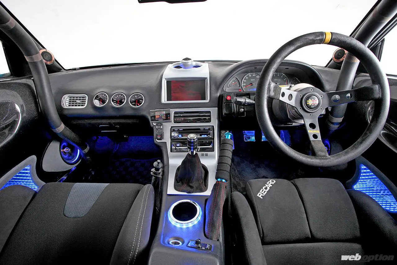 シートはいずれもレカロの限定バージョン(運転席=RS-GS、助手席=SR6)で、HPIの4点ハーネスもブラックでコーディネイトする。ロールケージはセーフィティ21の11点式をチョイス。