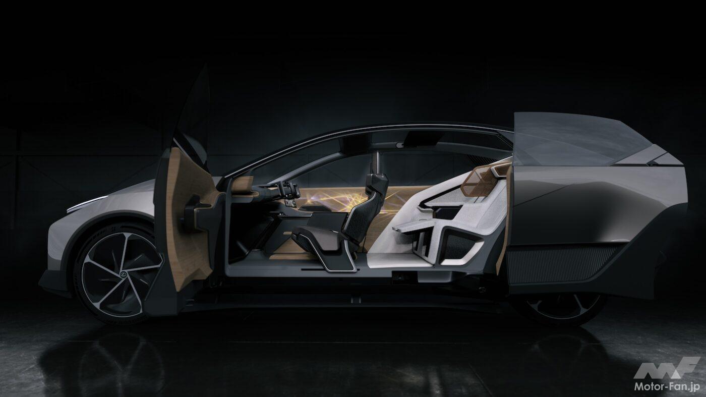 BEVならではのパッケージングの自由度の高さや空間効率の良さを生かした広々とくつろげるインテリアに従来のおもてなし装備をより先進的かつ心地よいモノとすることで、これまでになかったモビリティ体験を提供するという。