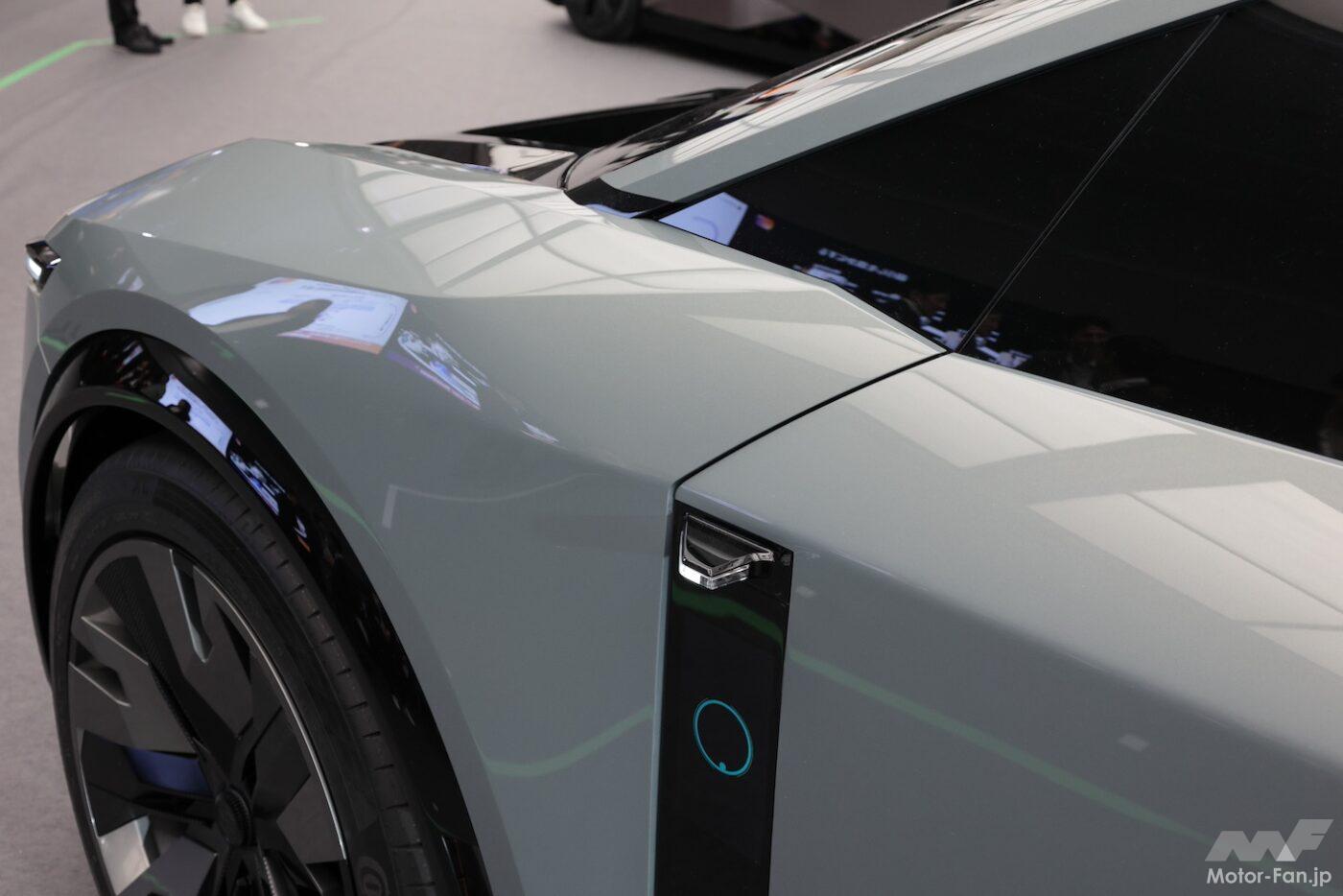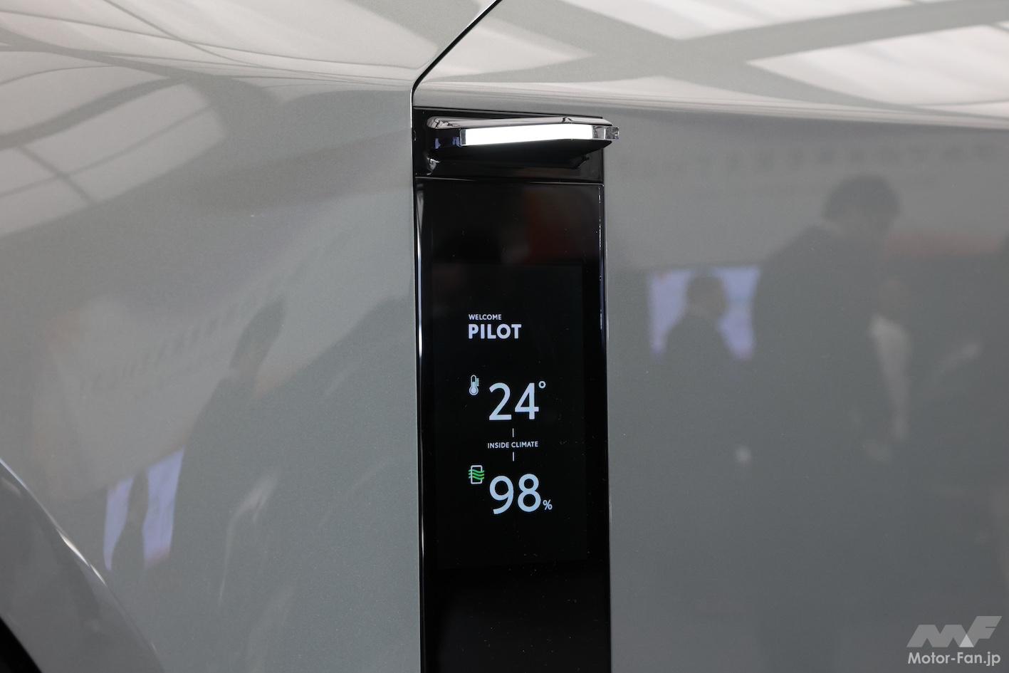 デザイン上の特徴は、立体を構成する目や線を極力シンプルにしながら先進性と美しさを両立したエクステリア。サイドボディの下部からドア上部に沿ってデジタルサイネージを配置し、ドライバーがクルマに近づくとバッテリー残量や車内温度、室内の空気の質などを表示する。