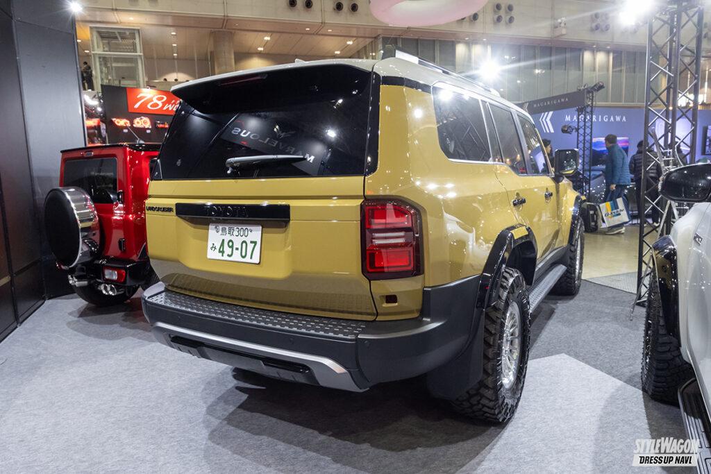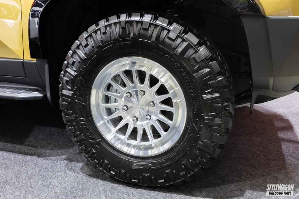マーベラスの提案は足まわりのカスタムメイク。そもそも「社外ホイールを履くとオフセットの関係ではみ出しがち」というランクル250。そこで開発したのが35ミリワイドになるオリジナルのオーバーフェンダーだ。奇抜なラインにならないようこだわって設計したというだけあって、まるで純正かのように自然な形状で膨らみを持たせている。これにより、前後ともに17インチ8J+35というホイールを履くことに成功している。さらにこのランクル250の迫力を増しているのが、リフトアップキットだ。フロントは45〜50ミリ、リアが25〜30ミリ上げることで、全高にして約50ミリのリフトアップを実現。圧倒的な存在感を車両に与えていると言って良いだろう。