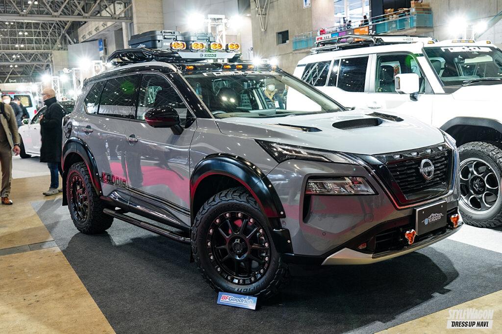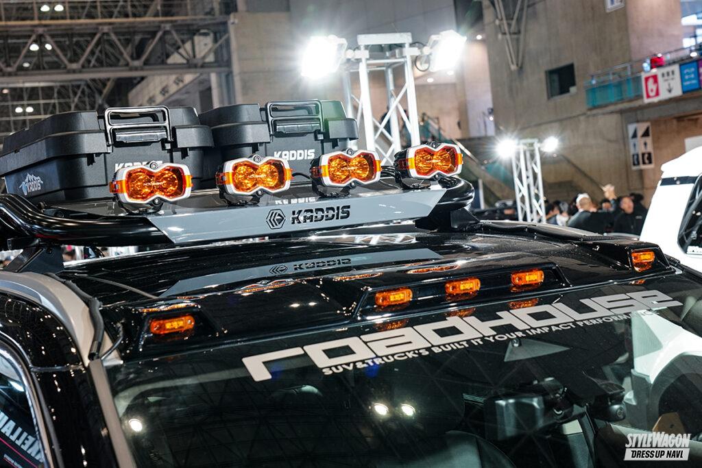 カディスを展開するロードハウスと聞いて、大胆なリフトアップを連想する人も多いだろう。隣のブースがエルフォードだったので、“上げ仕様”(ロードハウス)、“下げ仕様”(エルフォード)と対比することができたことも興味深かった。ロードハウスの250チューンの第一歩としては、まだボディリフトには着手せず、スプリングのみでリフトアップ。「懐が深いので、コレで35外径は入ってしまう」とのこと。もちろん外装パーツも準備。FRP製の『ファイバープロテクション』がその筆頭で、重量面が厳しくなる昨今の規制の中、軽量な樹脂製は心強い存在だ。ラダーやキャリア等々、タフさを感じさせるアイテムも多数。見事なルックスと高い実用性、その両方が調和した1台である。