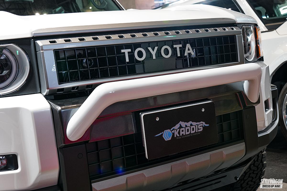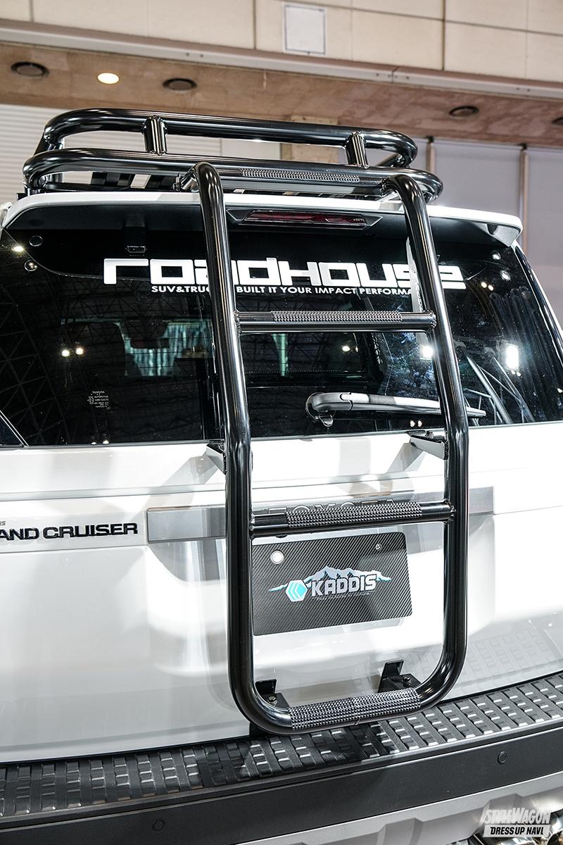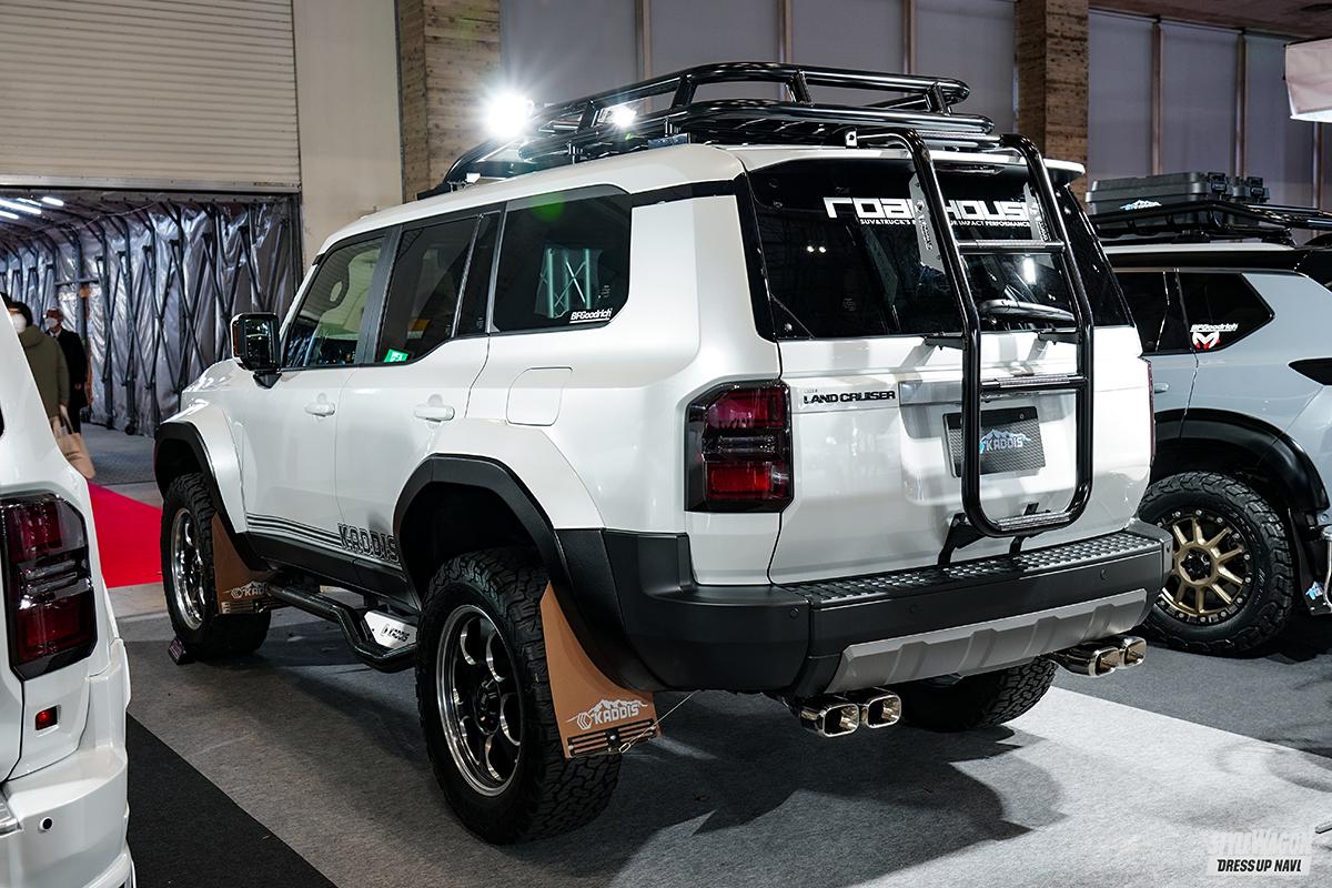 カディスを展開するロードハウスと聞いて、大胆なリフトアップを連想する人も多いだろう。隣のブースがエルフォードだったので、“上げ仕様”(ロードハウス)、“下げ仕様”(エルフォード)と対比することができたことも興味深かった。ロードハウスの250チューンの第一歩としては、まだボディリフトには着手せず、スプリングのみでリフトアップ。「懐が深いので、コレで35外径は入ってしまう」とのこと。もちろん外装パーツも準備。FRP製の『ファイバープロテクション』がその筆頭で、重量面が厳しくなる昨今の規制の中、軽量な樹脂製は心強い存在だ。ラダーやキャリア等々、タフさを感じさせるアイテムも多数。見事なルックスと高い実用性、その両方が調和した1台である。