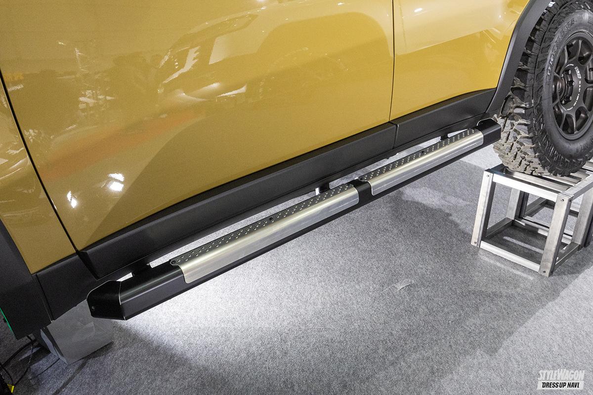 「車両製作のコンセプトはオフロードスタイルです」。シュピーラーのランクル250は後付けライトやルーフラックでガッツリとカスタムを施した1台だ。最大の見所はやはり足まわり。リフトアップを行い、大径タイヤを履かせているにもかかわらず乗り心地が良い、というのがこだわりだという。使用しているキットはアメリカのデザートレースでも非常にポピュラーな“キングショック”。加えて、リンク類も交換するなどして、今の車高を実現している。なお、フェンダーは敢えての純正状態。そのために、タイヤも大径でありながらナロータイプを履いているという。ちなみに、サイドステップやルーフラックはシュピーラーのオリジナルアイテム。実用性とカッコよさを両立させた、機能性パーツだ。
