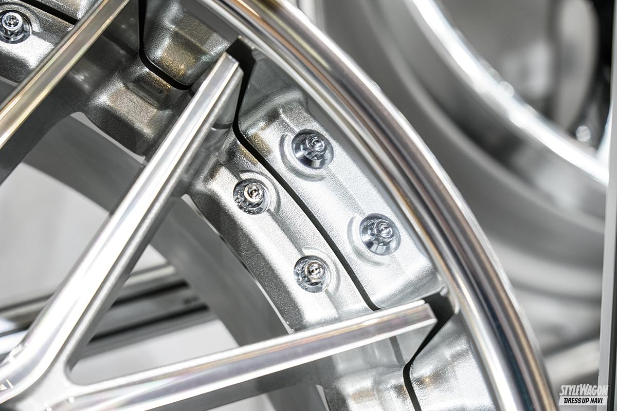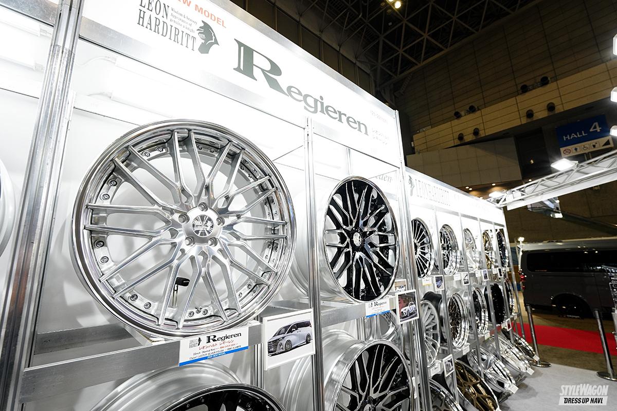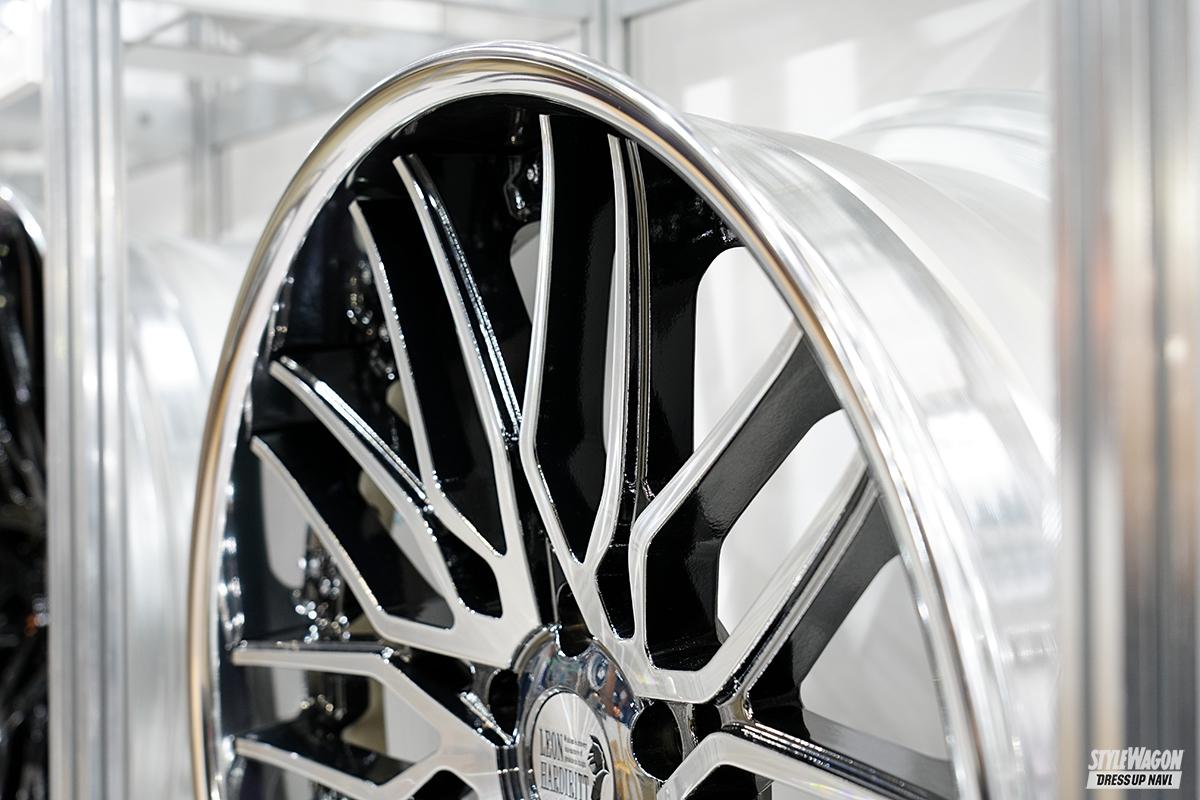 注目は『レギーレン』。音叉のようなツインスポークを組み合わせたラフメッシュモデルで、リムの外側を抉り、さらにピアスボルトは小径仕様を採用することで、大口径、足長を印象付ける。5穴に割り切り、P.C.Dが114.3、120でも違和感ないスタイルにまとめた点もポイント。さらに22インチモデルはリムオーバースタイルだからより一層大きく見える!