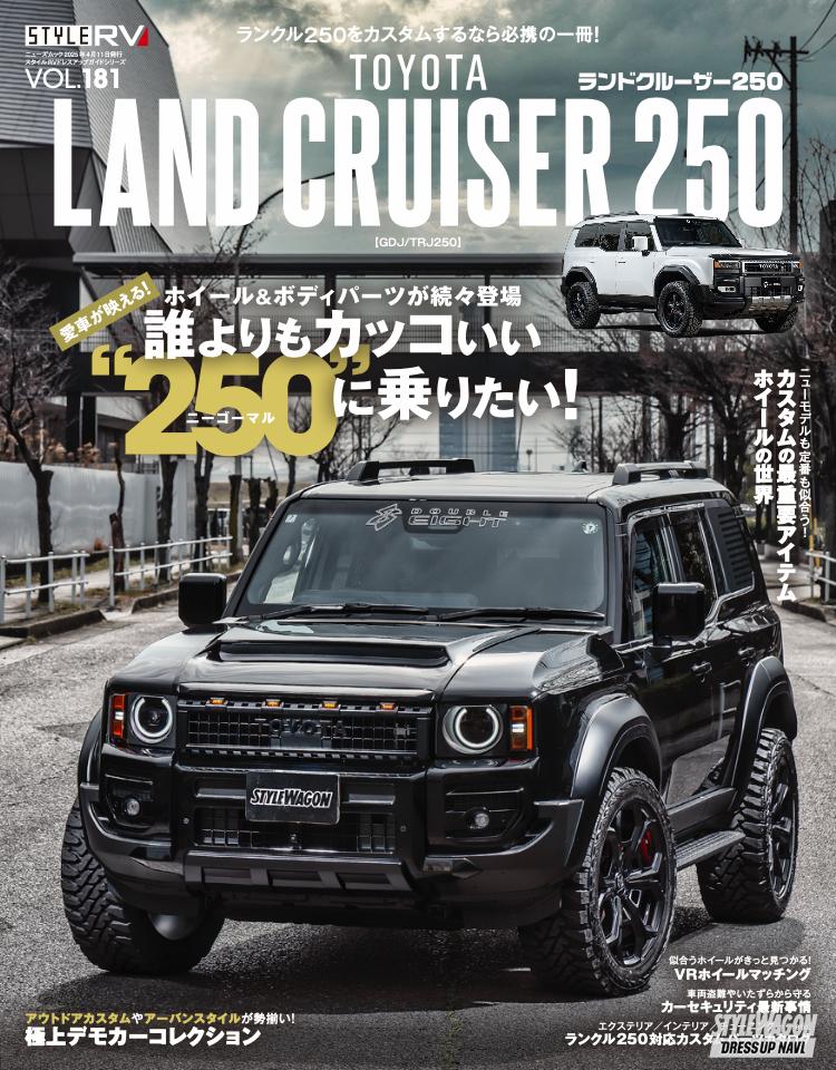 ランドクルーザーといえば、日本国内を代表するSUVでもあり、世界的にも人気を誇る車種としても知られる。150系ランドクルーザープラドの後継車種として、満を持してデビューしたランドクルーザー250にもその血筋は受け継がれている。徐々にカスタムパーツも充実してきて、2025年。ついにその勢いが爆発してきている。おしゃれに乗りこなすシティスタイルから、ワイルドに乗りこなすクロカンスタイルまで、その豊富な振り幅もランクル250が内包する魅力の一つ。本誌では、その“魅力”に迫りつつ、「自分だけ」の一台を作り込める世界を紹介。見所多数な「スタイルRV Vol.181 トヨタ ランドクルーザー250」を手に取り、世界にひとつだけの自分のための愛車を目指してみよう!