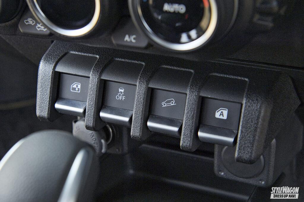 インパネのデザインやシートのトリムなどは基本的にジムニーシエラと共通。ただし、リアドアのパワーウインドウを操作するスイッチがセンターコンソールとリアドアに新設されている。