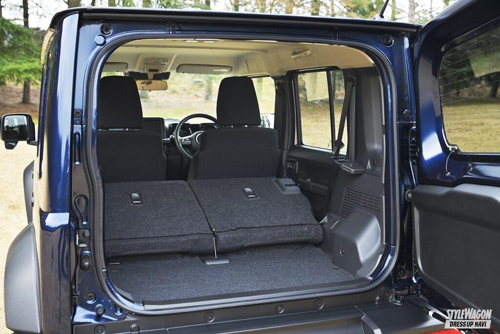 ちなみに340mmというホイールベース延長の値は、ジムニーらしい見た目を維持する最小限の値とすることを大前提に、後席の乗降性が成立するギリギリのラインを検証した結果とのこと。リアドアを開けたときのBピラーとリアシート座面までの幅は300mmとなり、十分に乗り降りしやすいスペースが確保されている。