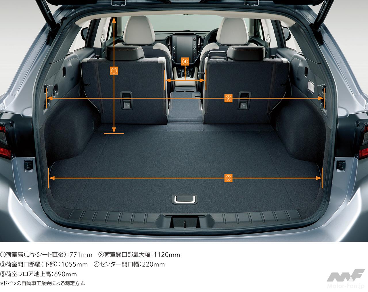 荷室は561ℓを確保(カーゴフロアボード上部:492ℓ/サブトランク:69ℓ)するとともに、4:2:4分割可倒式リヤシートによって荷室を自由に拡張することで、大きな荷物や長尺物の搭載も可能。また、ハンズフリーオープンパワーリヤゲートを搭載することで、両手がふさがっているときでも体の一部を六連星オーナメントに近づけることでリヤゲートが自動で開き、スマートに荷室へアクセスできる。