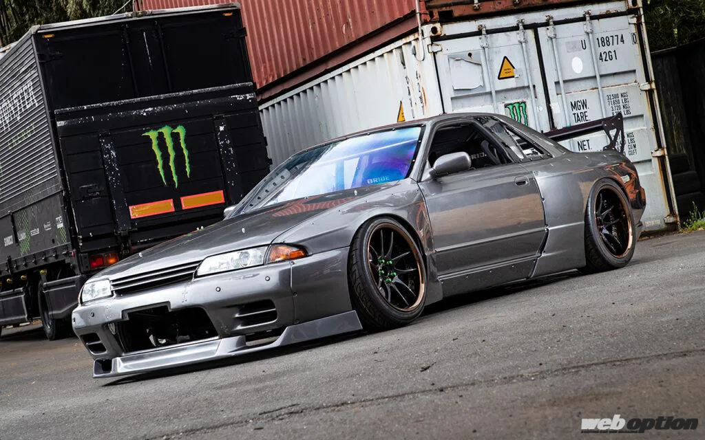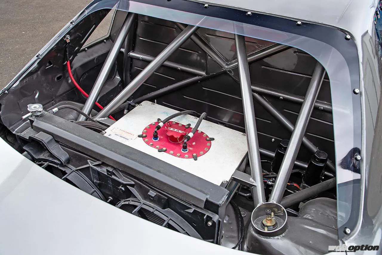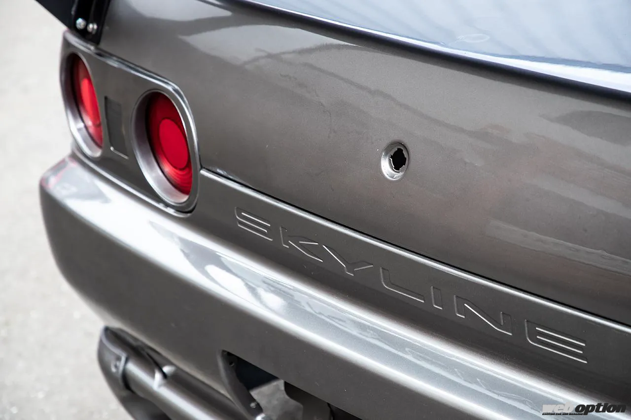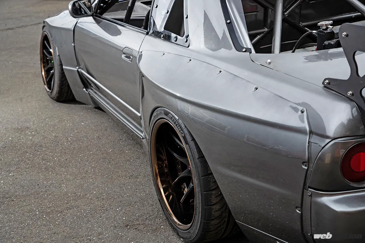 エクステリアは、パンデム最新のR32 GT-Rワイドボディキットv1.5を装着。v1.0と比べてフロントリップスポイラーやリヤウイングなどの形状が変わっており、よりレーシーな雰囲気が表現されている。バルクヘッドの作り直しに伴って交換されたフロントウインドウは、軽量化も実現するためアクリル製に変更済みだ。