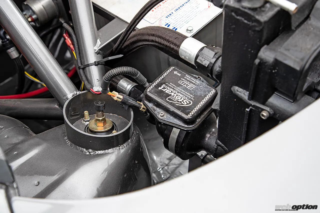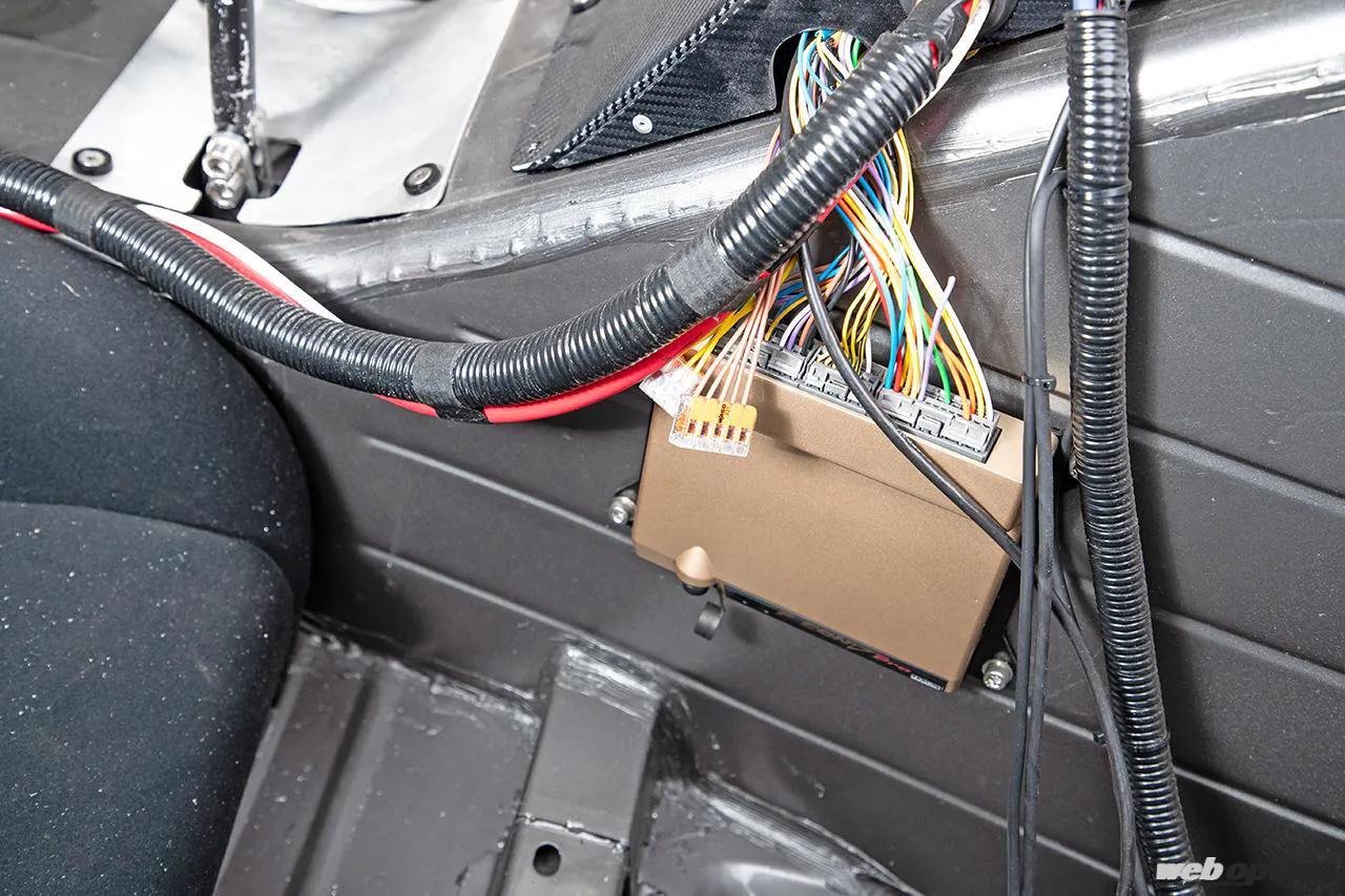 メタルパネルで製作されたセンターコンソールには、レースパックのデジタルダッシュと無骨なトグルスイッチをレイアウトし、エンジンを制御するF-CON Vプロも取り付けられている。