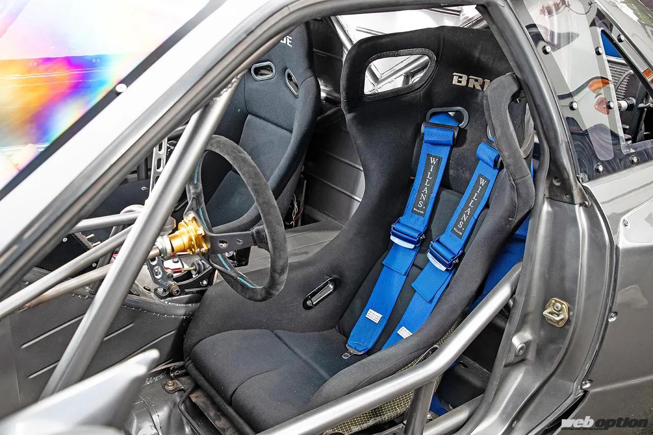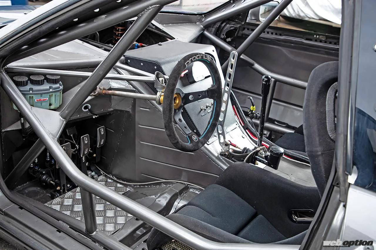 BRIDEのフルバケットシートを一番後ろまで下げられる位置を起点とし、足の届く場所にチルトンのペダルアッセンブリーを装着。それによりエンジンの搭載位置が決定し、エンジンを支えるフレームと連結する形で室内側にもロールケージを張り巡らせている。UCF30型セルシオ用のステアリングギヤボックスを左右逆に取り付けることで、左ハンドル化を実現していることもトピックだ。