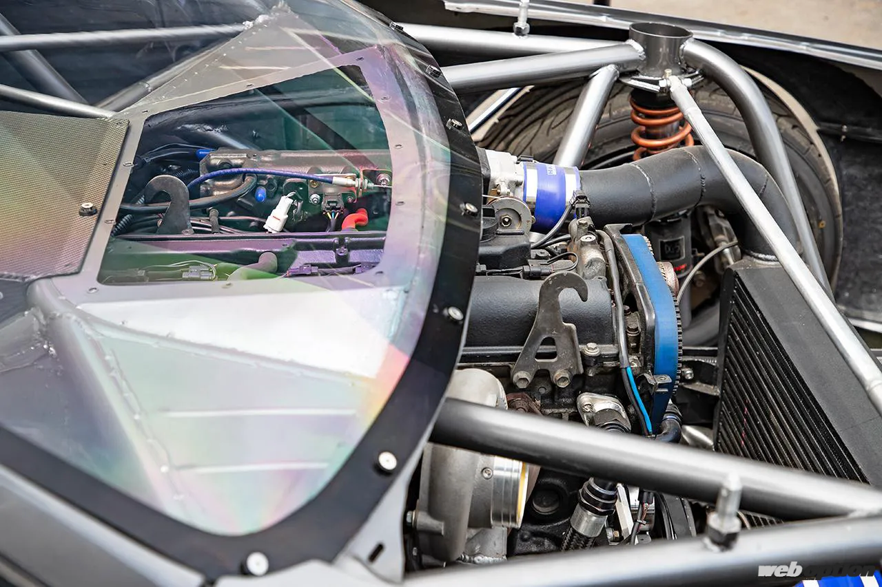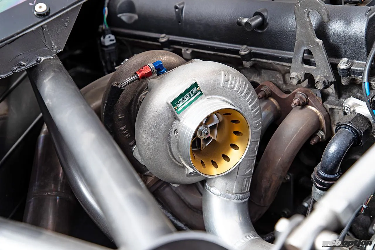 タービンはレスポンスに優れたHKSのGTIII-4Rで、排気は右フロントフェンダーから覗くフルストレートパイプから行われている。ピークパワーは800psを想定している。