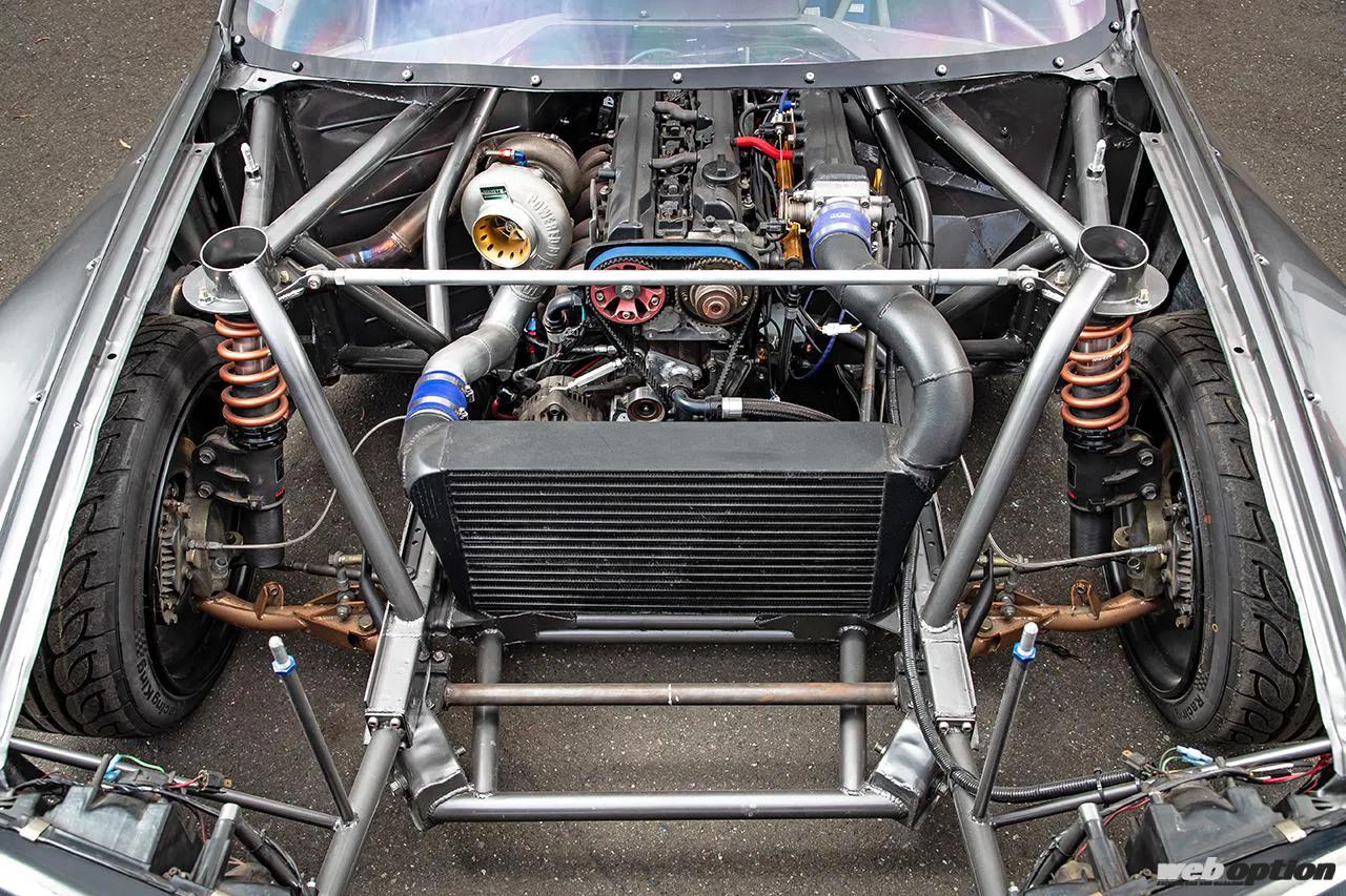 細部のメイキングは強烈だ。エンジンはBCのストローカーキットを組んだ3.4L仕様の2JZ-GTEを、室内側にセットバックして搭載。駆動系は、HGTの5速シーケンシャル→カスタムメイドのカーボン製プロペラシャフト→クスコのLSDを内蔵したR200デフケース→純正ドライブシャフトという組み合わせにより、フロントミッドシップのリヤドライブを実現している。