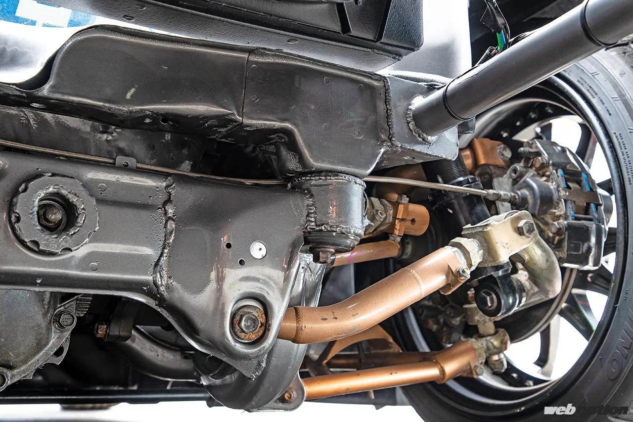 ホイールはワークエモーションCR 3ピース(F9.5J R10.5J)を装着。ブラックディスクとブロンズリムを組み合わせ、ワイドフェンダーにベストマッチな深リムを実現させている。サスペンションはDG-5の車高調とMAXドリフトの調整式アームを使用。ブレーキはノーマルだが、室内側にウィルウッドの油圧ハンドブレーキを備え、ドリフトのための操縦環境を整えている。