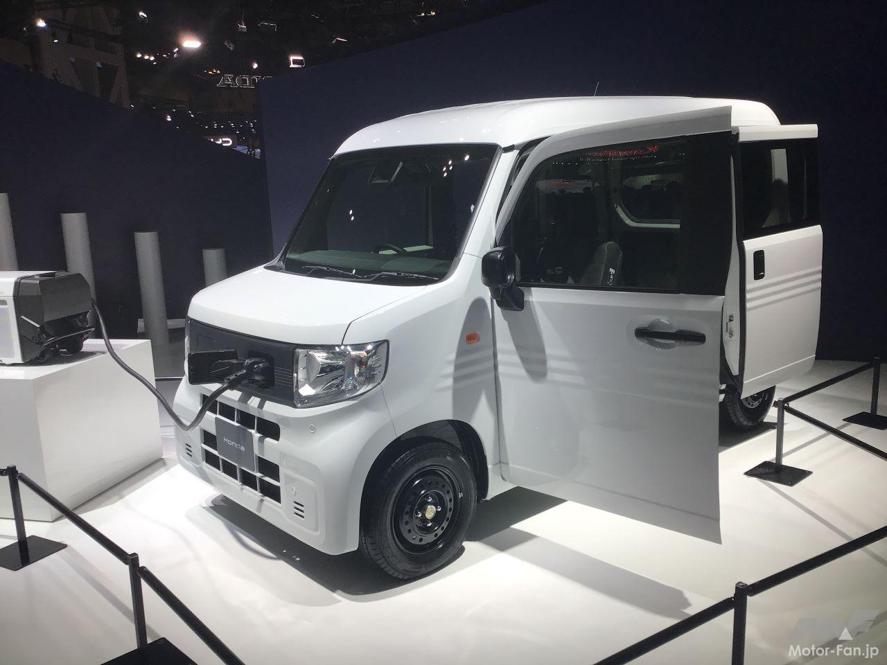 フロントグリル部分の充電口に外部給電器のケーブルをつないだ状態で展示されているN-VANは、2024年春に市販予定の「N-VAN e:」。一回の充電で200km以上が走行できるという実用的な軽商用EVだ。