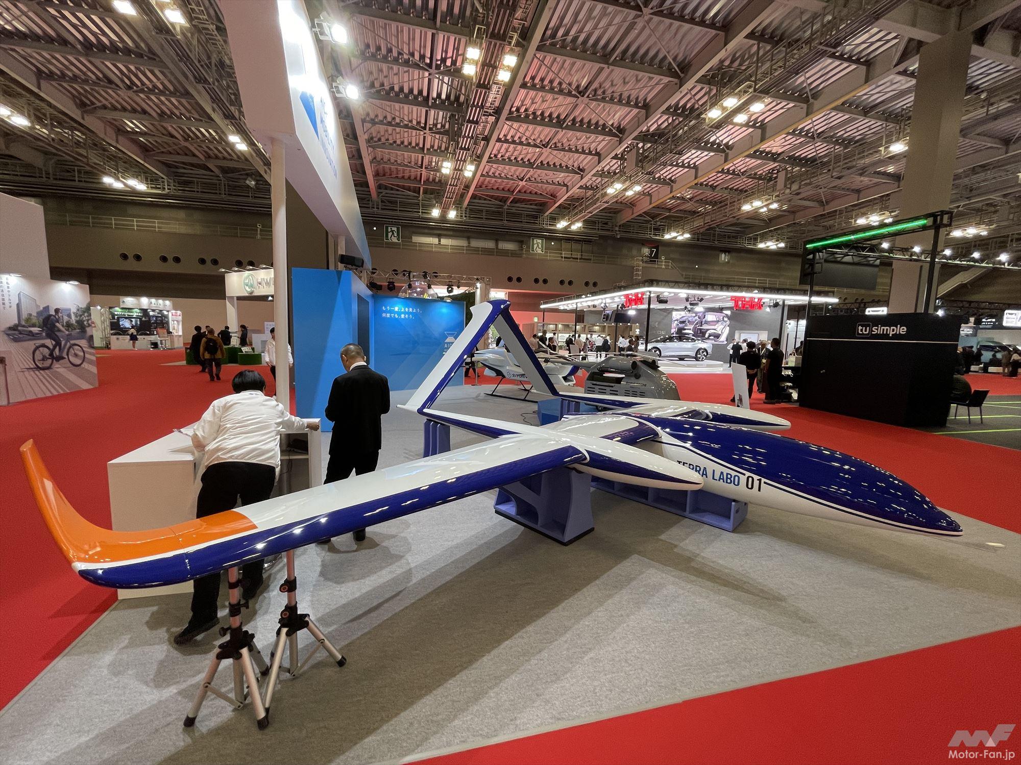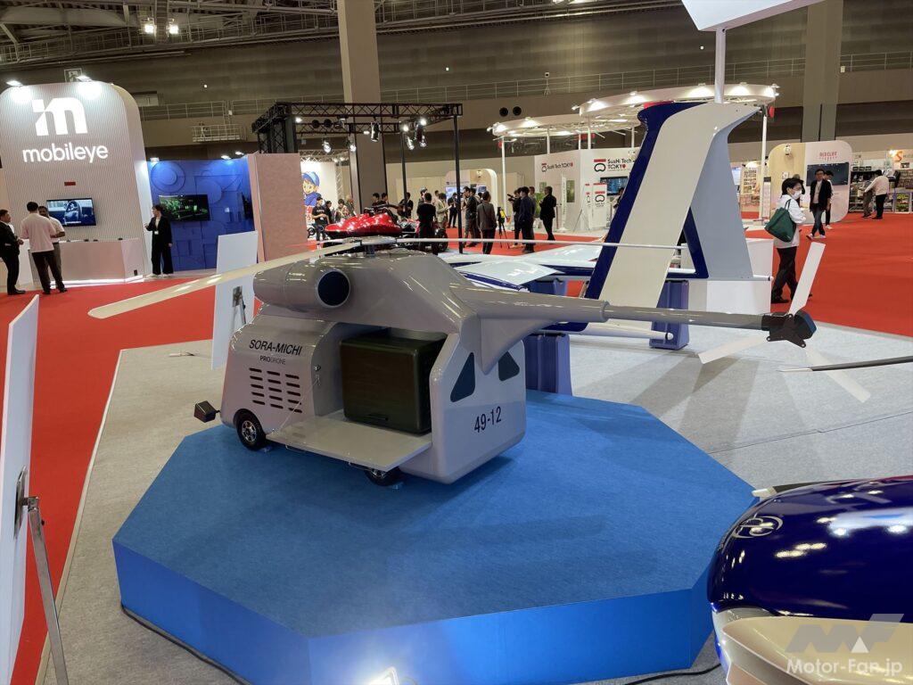 愛知県のブースではSORA-MICHI以外にも、テラ・ラボの危機対策用長距離無人航空機「TERRA Dolphin Long Range Mode」と、SkyDriveの空飛ぶクルマ「SD-03」が展示されている。