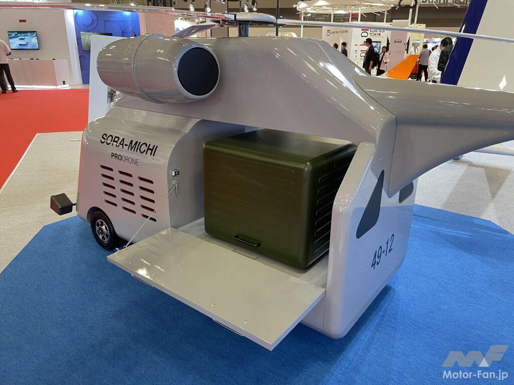 プロジェクトの一環として、愛知県は10月25日から東京ビッグサイトで開催されているジャパンモビリティショー(旧:東京モーターショー)にブースを出展。翌26日にプレスブリーフィングを実施し、プロドローンが手掛けた「SORA-MICHI」を世界初公開した。SORA-MICHIはプロドローンの技術の粋を結集した無人のカーゴドローン。“空飛ぶ軽トラ”がコンセプトとして掲げられており、50kg積載で50kmを飛行できる。飛行時にはメインローターとテールローターのふたつの回転翼を使用するが、駆動輪も持っており、自走も可能。山間部などは空路で移動し、“ラストワンマイル”は地上走行するというアイデアだ。