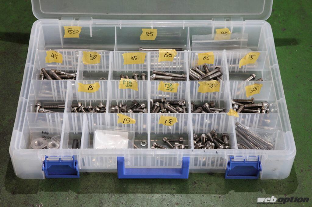 ウチではエンジンを始め、ボディ、シャシー、駆動系、足回りなどの要所にはできるだけチタンボルトを使うようにしている。その理由は三つ。強度的に優れている。軽量化を実現する。でも、一番の理由はテクニカルスポーツ時代、HRCのワークスマシンではほとんどの部分にチタンボルトが使われているのを実際に見たから。機能性の高さだけでなく、見た目にもカッコ良いんだから、それを使わない理由はない!