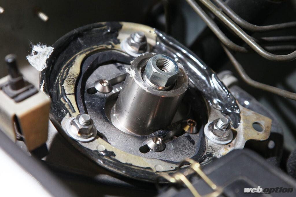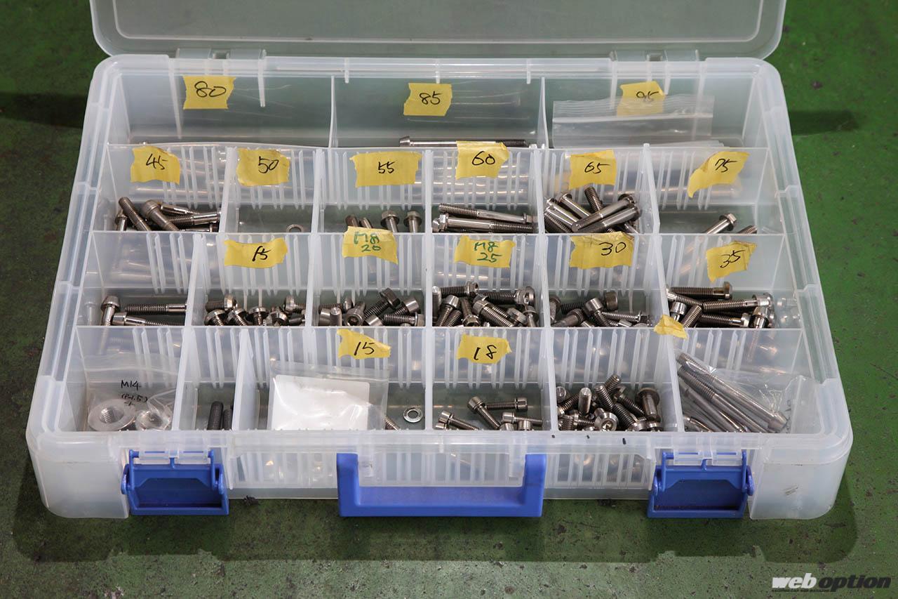 また、錆びない以外にも大きな効能がある。まずチタンには二種類あって、一つが原発にも使われるほどの強度を誇る『64(ロクヨン)チタン』。その素材を手に入れてオリジナルで作ったボルトをウチでは使ってる。64チタンはスチールやアルミのように伸びたりしないから、締結剛性が劇的に向上。つまり、純正ボルトと交換するだけで補強にもなるというわけ。それって凄いと思わない?