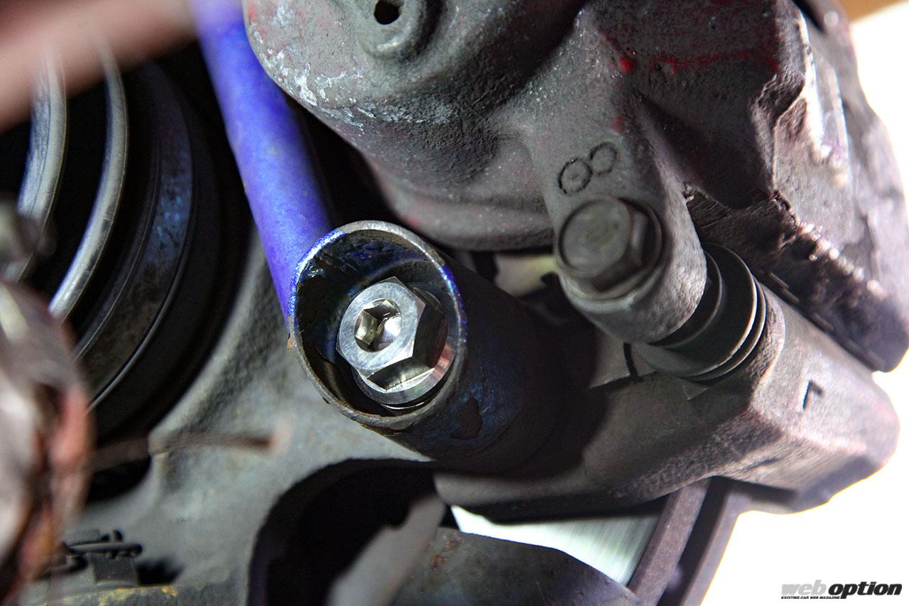 これはブレーキキャリパー固定ボルトをチタン製に置き換えた例。乗り出してすぐに、ペダルタッチがリニアになるだけでなく、フロント周り全体の剛性がアップしていることがわかると好評なメニューだよ。