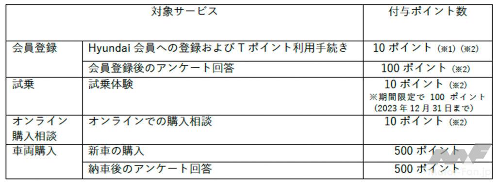 ヒョンデ公式サイト(https://www.hyundai.com/)に会員登録し、Tポイント利用手続きを行なうと“会員登録”“試乗”“オンライン購入相談”“車両購入”でTポイントが貯まる。付与ポイント数は下表のとおり。
