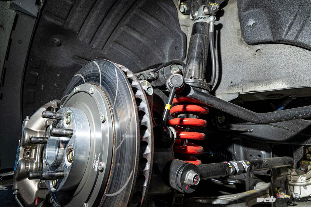 サスペンションは、韓国のサスペンション&ブレーキメーカー「ネオテック」の製品を軸にセットアップ。その他、リヤについては調整式のロワアームも装着。基本的なパッケージはパイクスピーク仕様と同様だが、足回りのセッティングは筑波サーキット仕様に大きく見直しているそうだ。