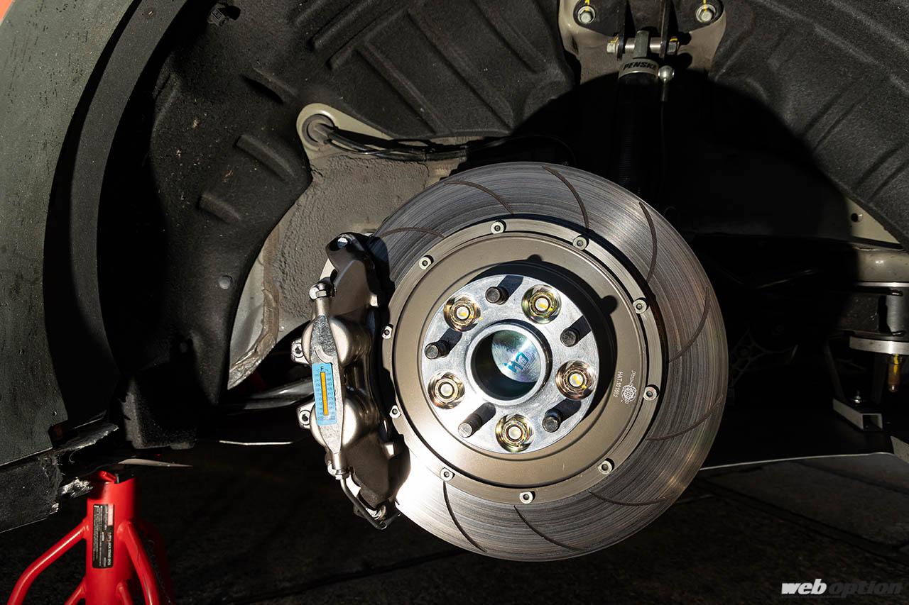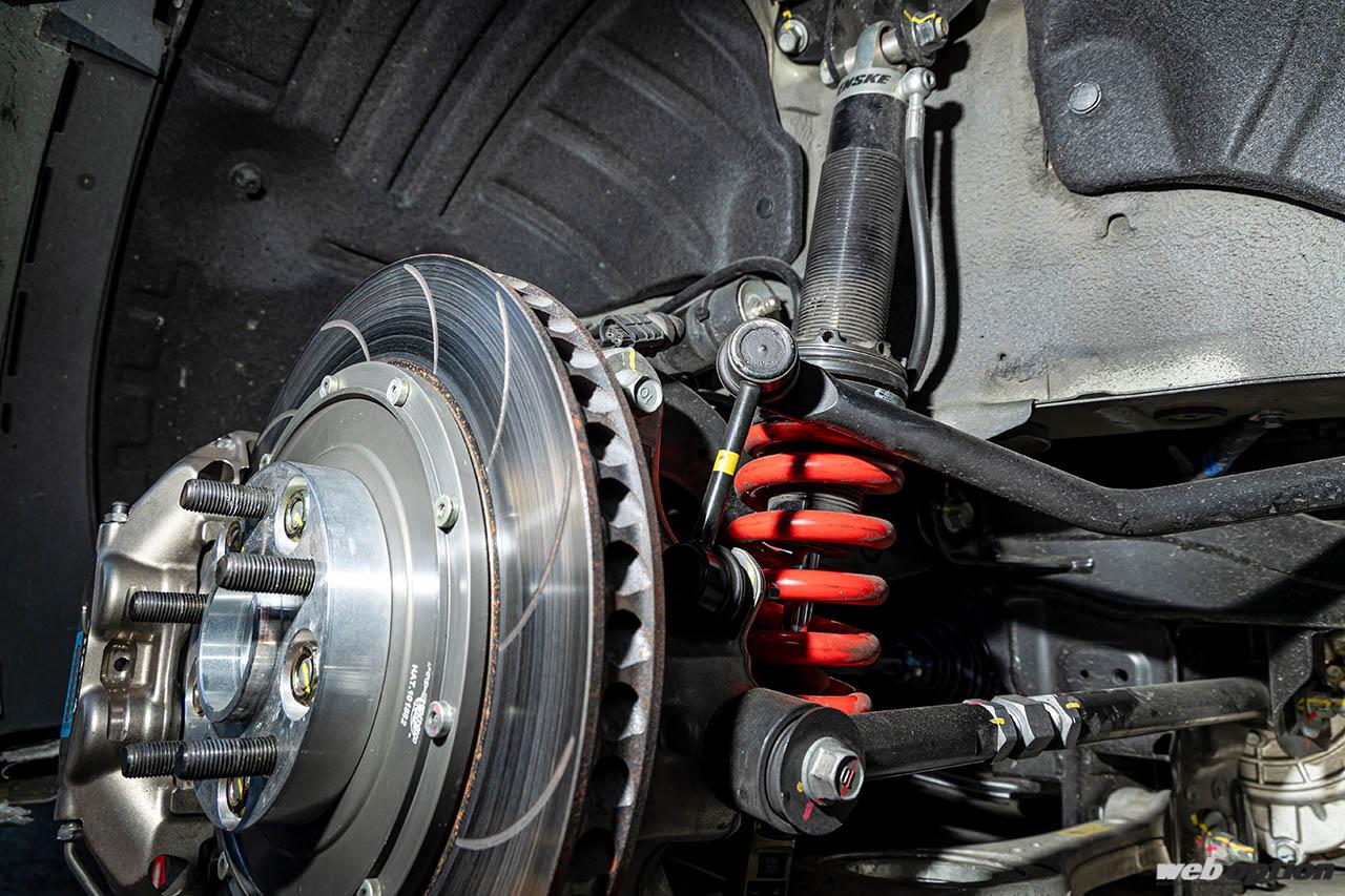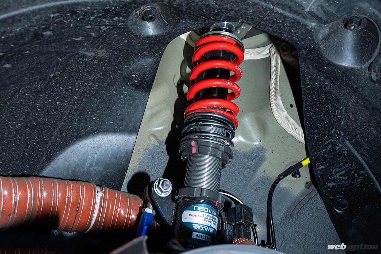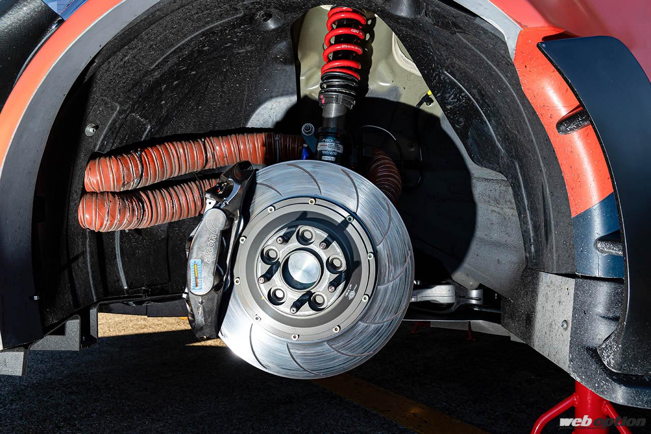 サスペンションは、韓国のサスペンション&ブレーキメーカー「ネオテック」の製品を軸にセットアップ。その他、リヤについては調整式のロワアームも装着。基本的なパッケージはパイクスピーク仕様と同様だが、足回りのセッティングは筑波サーキット仕様に大きく見直しているそうだ。