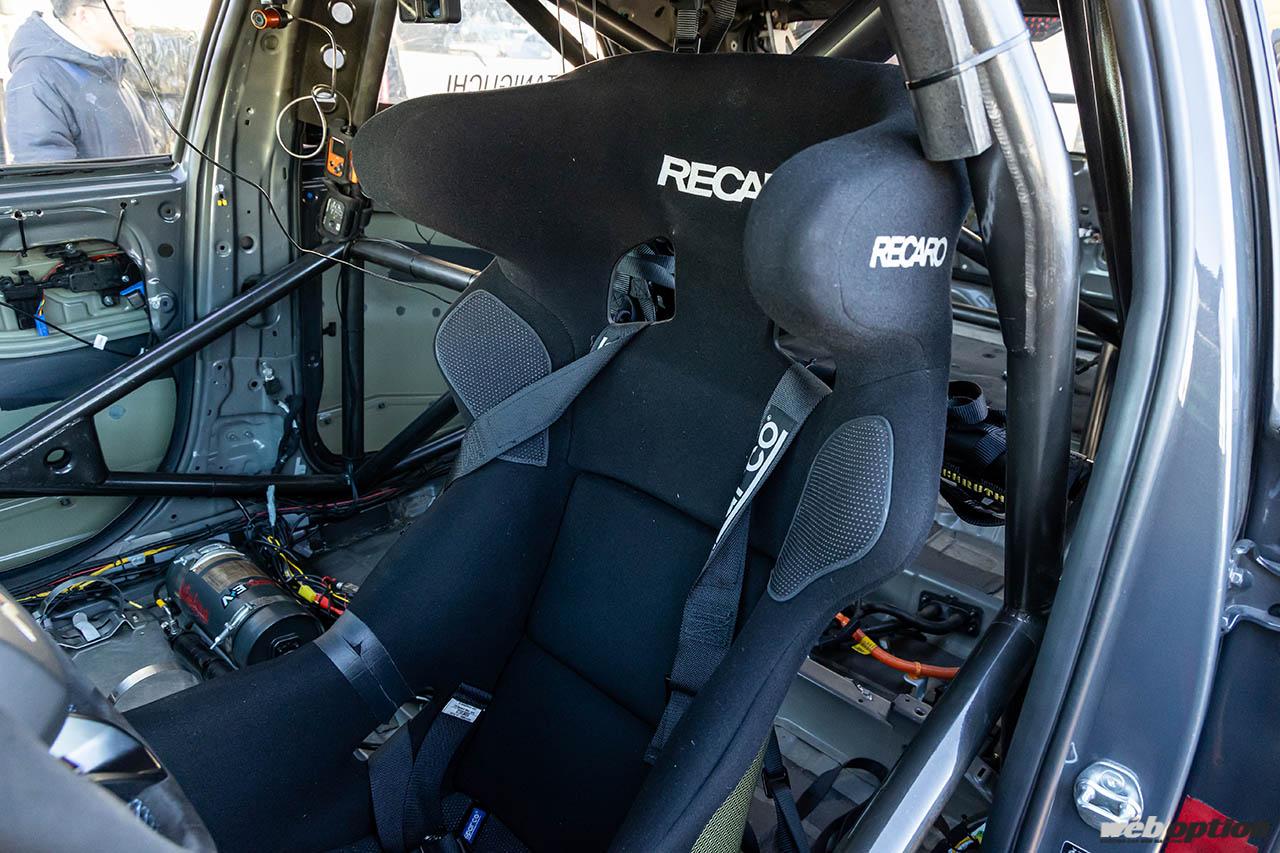 バケットシートはHANSに対応したレカロのプロレーサーSP-Aで、サベルト製6点式ハーネスを組み合わせる。ちなみに、車重はノーマルが2210kgで、この車両は1980kgと200kg弱のシェイプアップに成功している。とはいえ、重量級であることに変わりはなく、この辺りは大容量のバッテリーを積んだ電動SUVの宿命と言えるだろう。