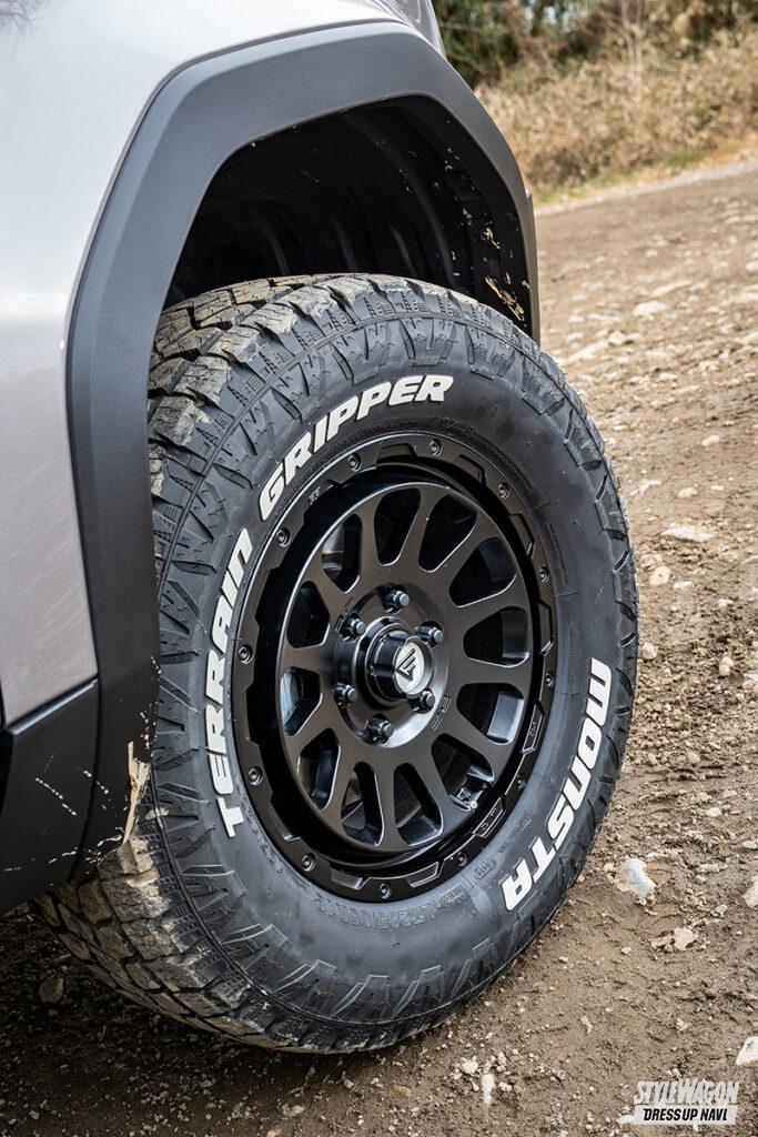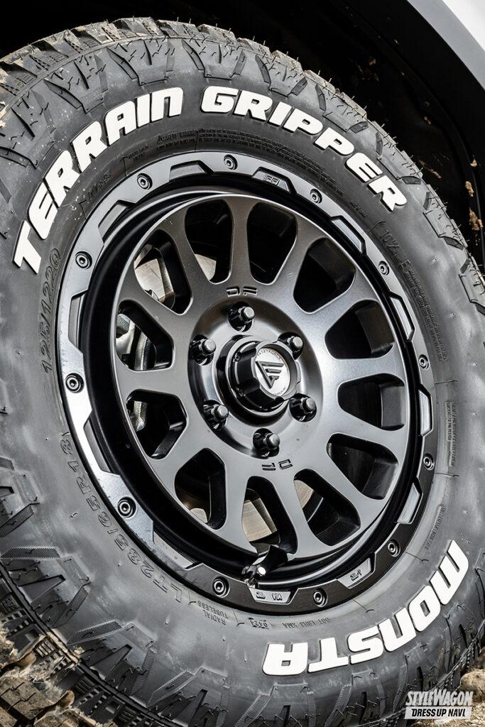 デルタフォースのオリジナルホイールデビュー作であるオーバルは、ありとあらゆる国内外SUVユーザーが愛用している大ヒットモデル。多くの人に選ばれる理由のひとつは、四駆カスタムのトレンドをしっかりと押さえていること。センターからラウンドしながら伸びていく12本スポークと安定感をもたらす角を丸めた六角形のホールの組み合わせが、足元に重厚な雰囲気を注入する。またリムフランジのゴツいデザインも大きな特徴。ダミーボルト配した部分を盛り上げ、逆にボルトの間は凹ませることでビードロックリングのようなタフ感を演出。サテンブラックのカラーも足元をビシッと引き締め、複雑なホイールデザインとのバランスも上々だ。
