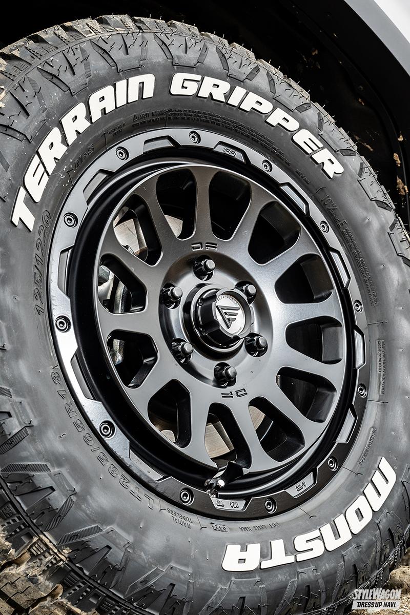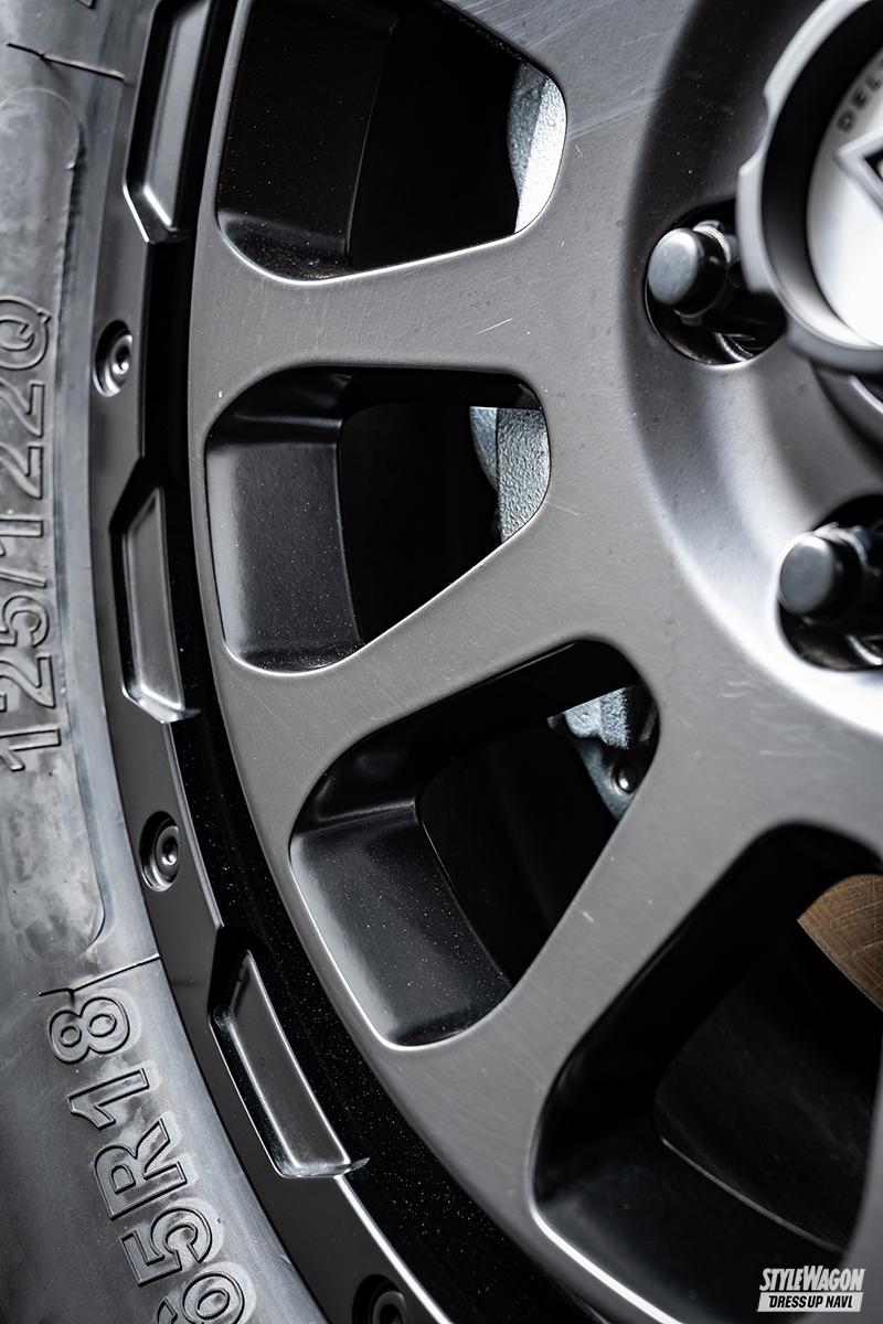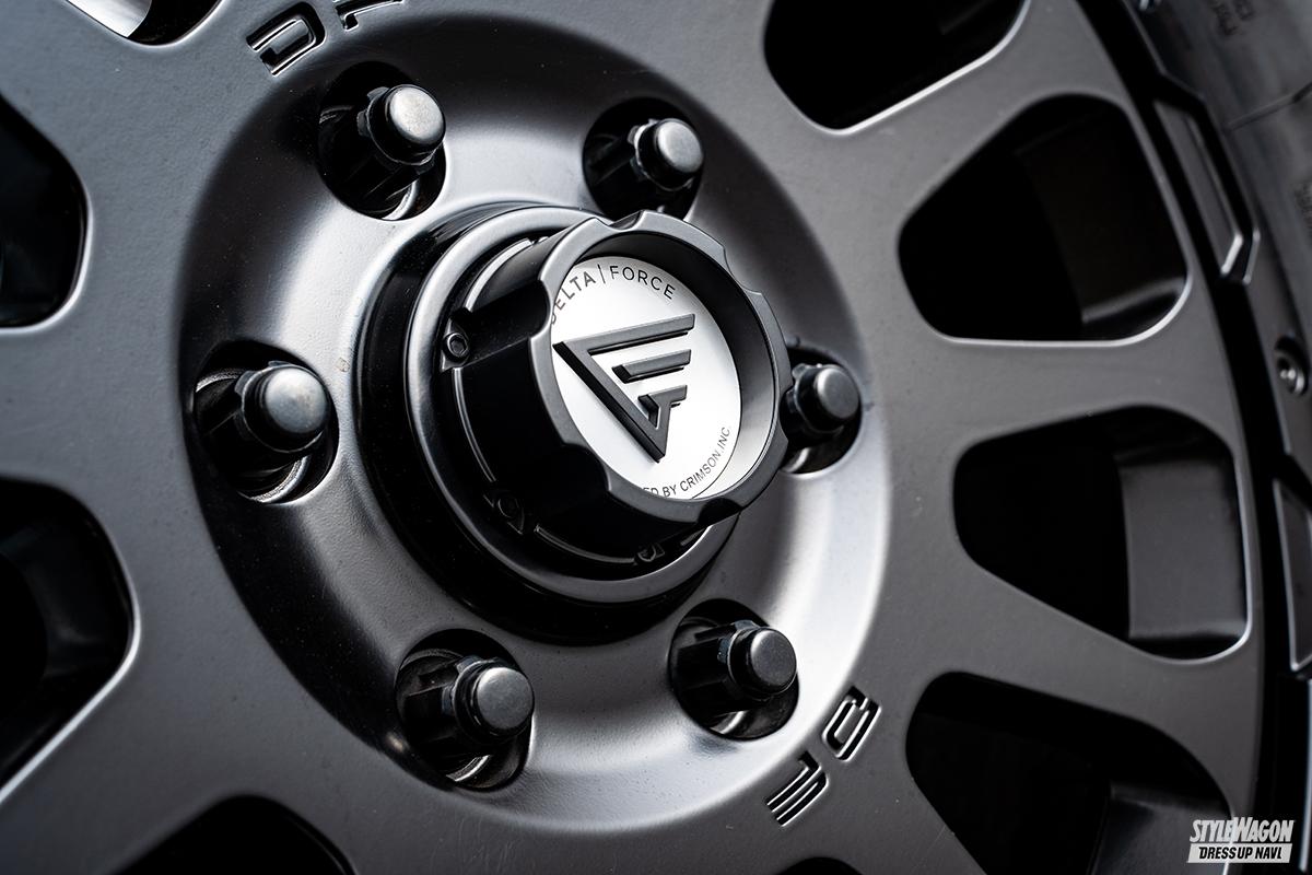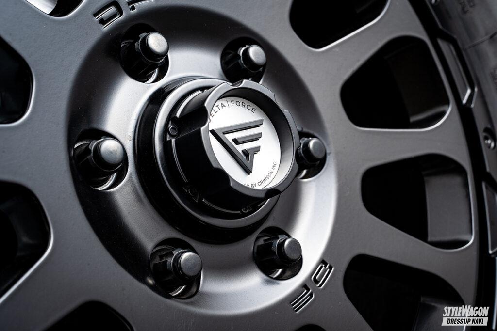 デルタフォースのオリジナルホイールデビュー作であるオーバルは、ありとあらゆる国内外SUVユーザーが愛用している大ヒットモデル。多くの人に選ばれる理由のひとつは、四駆カスタムのトレンドをしっかりと押さえていること。センターからラウンドしながら伸びていく12本スポークと安定感をもたらす角を丸めた六角形のホールの組み合わせが、足元に重厚な雰囲気を注入する。またリムフランジのゴツいデザインも大きな特徴。ダミーボルト配した部分を盛り上げ、逆にボルトの間は凹ませることでビードロックリングのようなタフ感を演出。サテンブラックのカラーも足元をビシッと引き締め、複雑なホイールデザインとのバランスも上々だ。